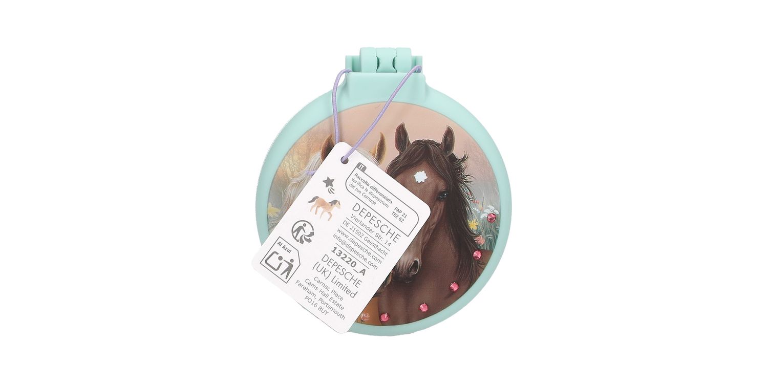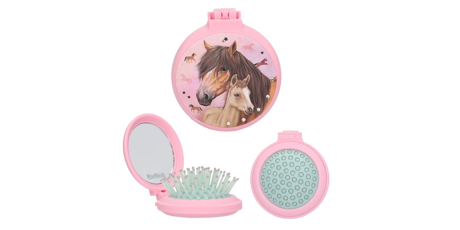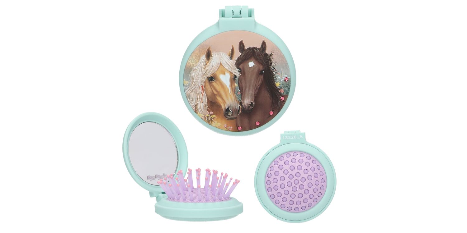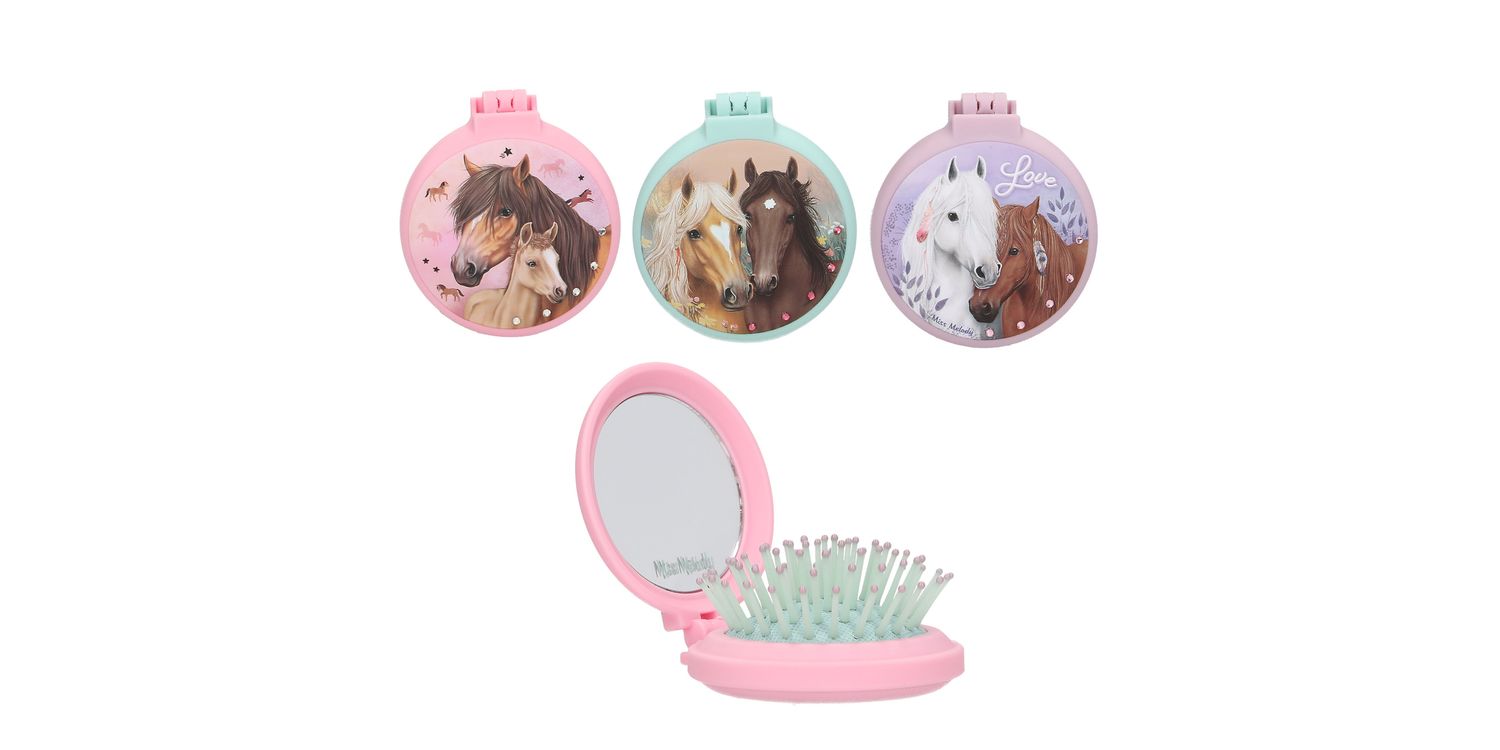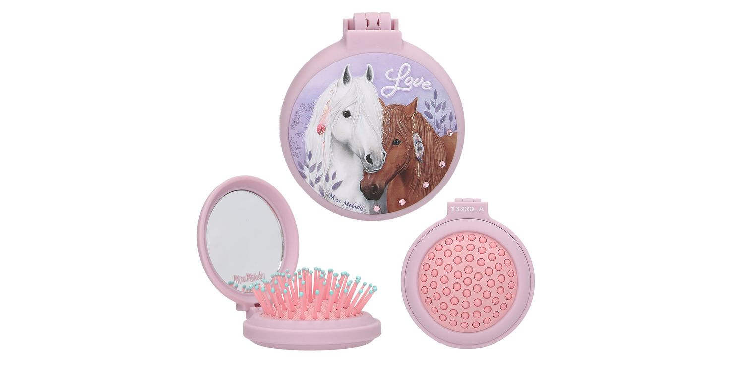 The round folding hairbrushes from Miss Melody have pretty horse motives on the outside, which are embellished with rhinestones. The inside has a mirror and bristles that stand up when opened.
