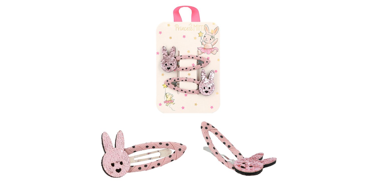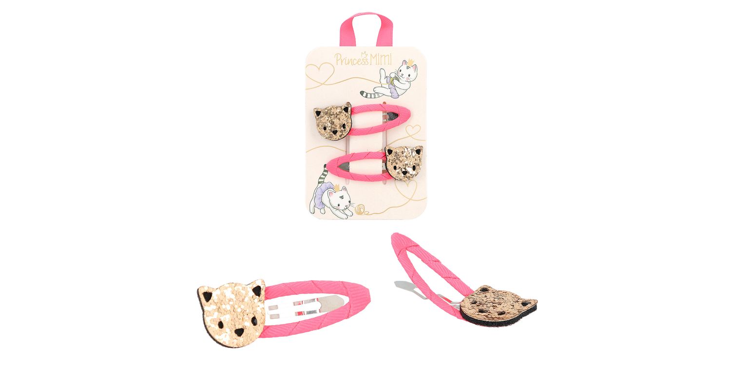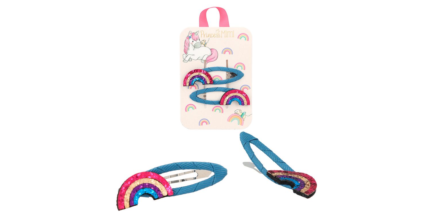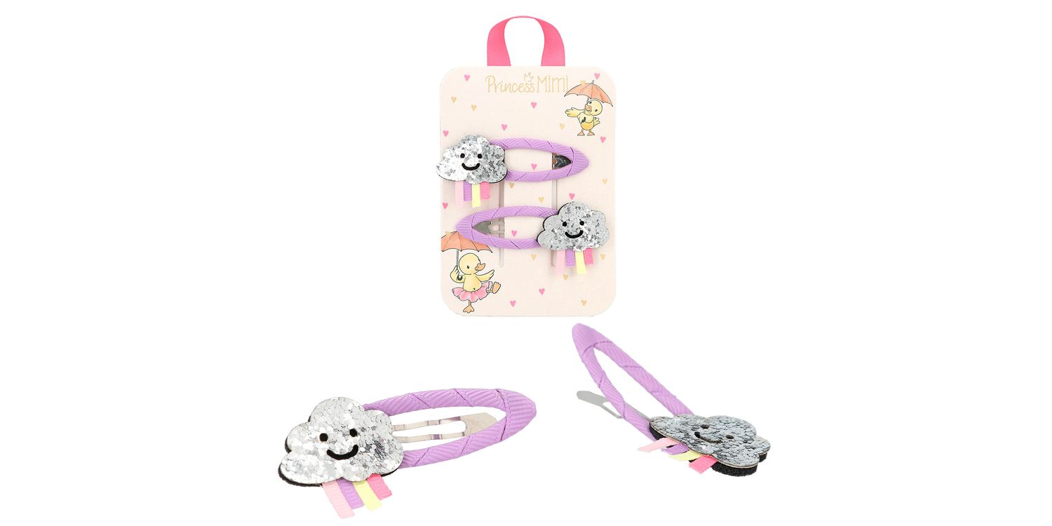 Dreamlike cute hair clips by Princess Mimi: The clips are wrapped with coloured fabric ribbon and have a glittery application. 4 designs - one sweeter than the other: silver clouds with purple clips, rainbow with blue clips, golden cats with neon pink clips and pink bunnies with pink dotted clips. 2 hair clips per card.