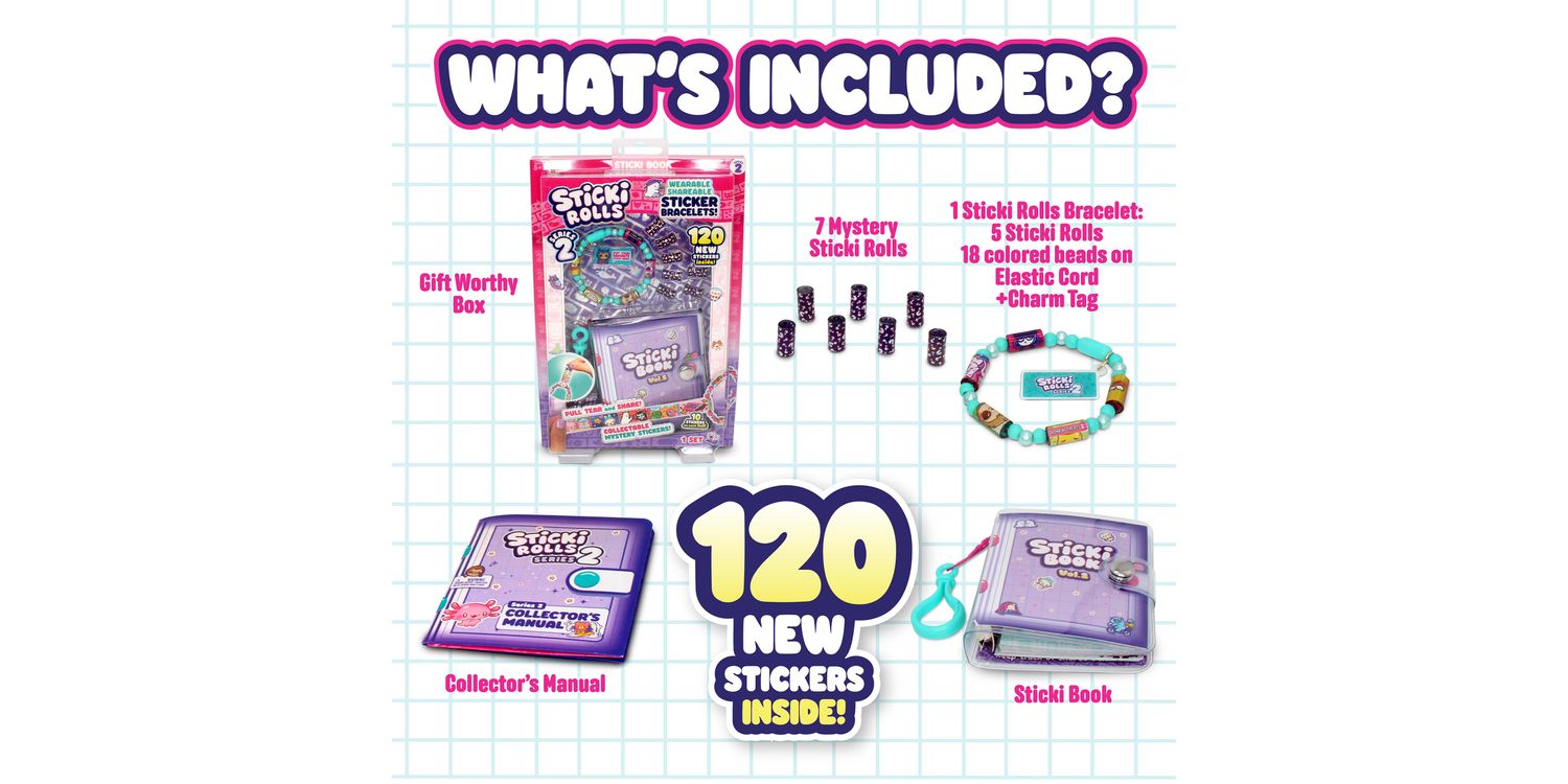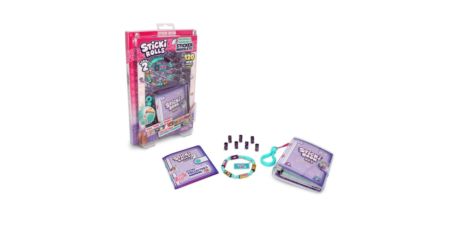 Introducing the Sticki Rolls Sticki Book, the ultimate way to organize and showcase your sticker collection! This pack includes a Sticki Rolls bracelet, 7 additional MYSTERY Sticki Rolls and a fun and interactive book includes 50 activity pages designed to keep your Sticki collection neatly organized.