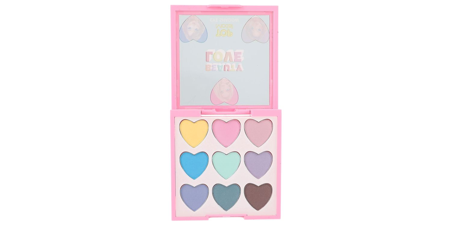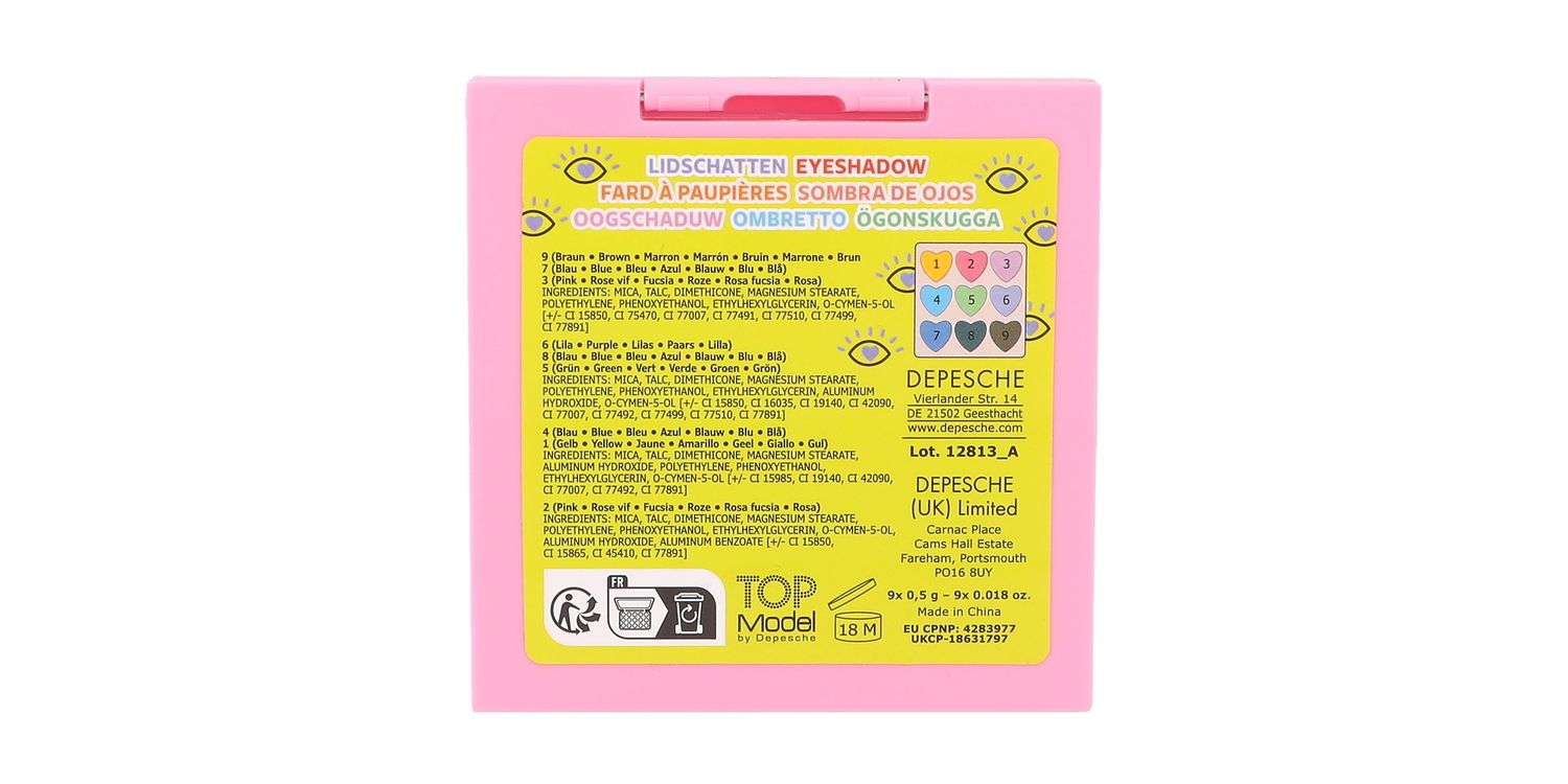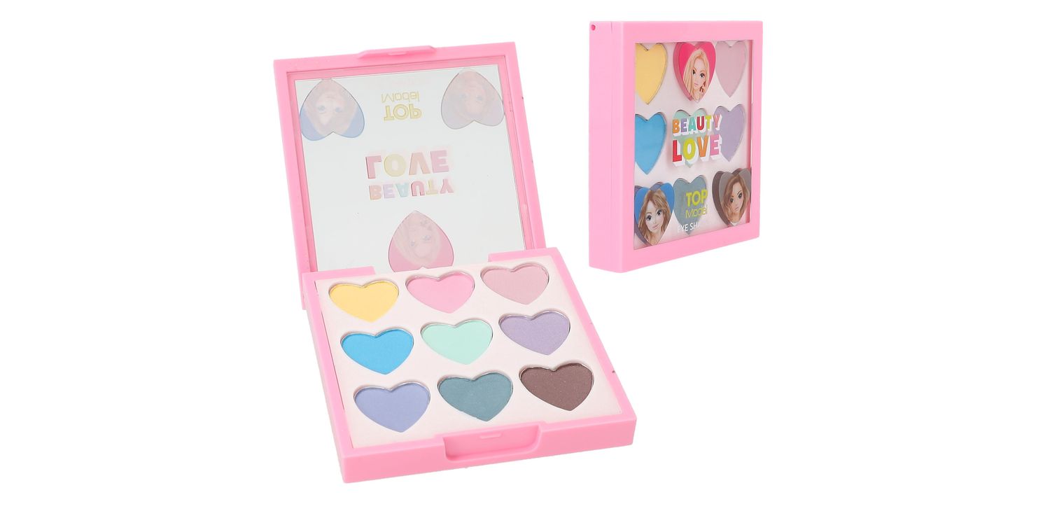 A heart for strong colours: The eye shadow palette from TOPModel offers 9 cool colours for unusual and slightly glittery eye make-up. Including: yellow, pink, pink, light blue, light green, purple, dark blue, brown and blue.