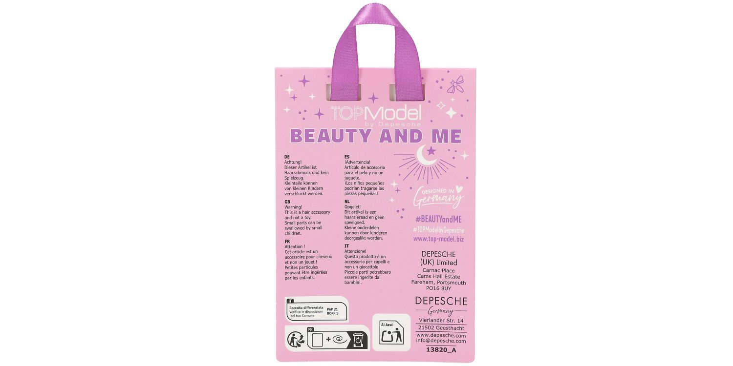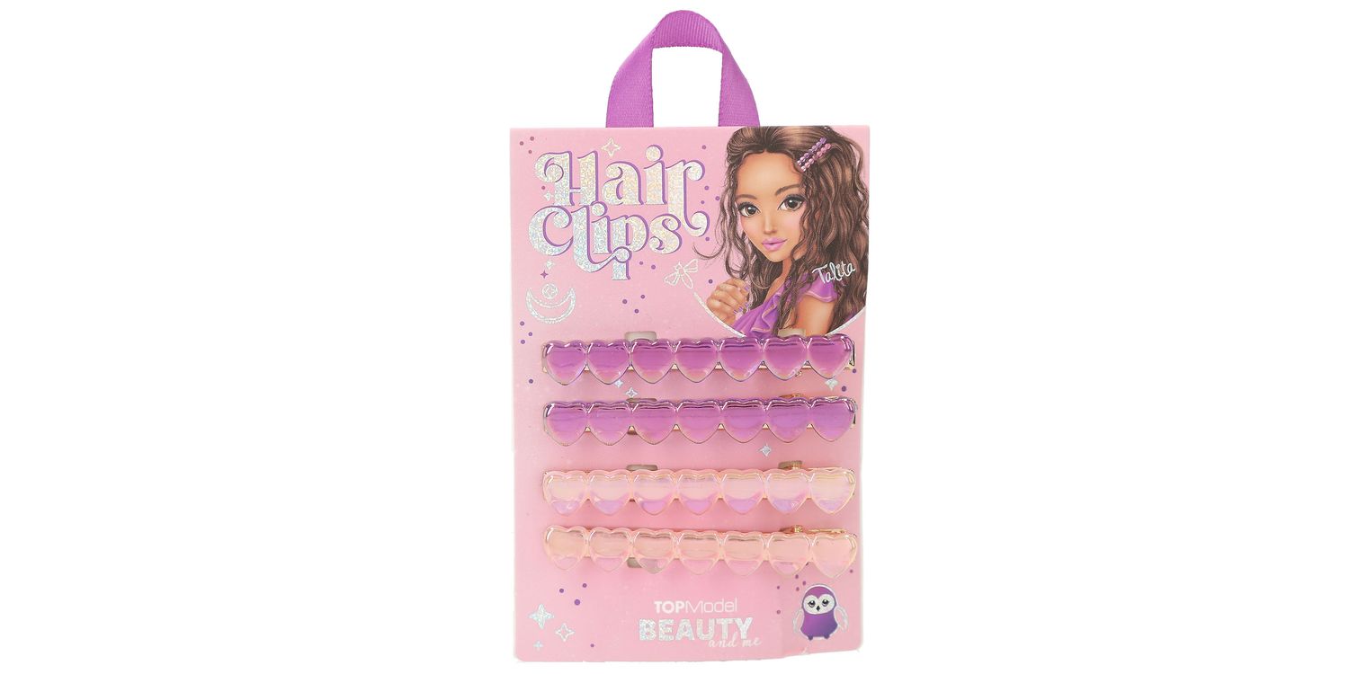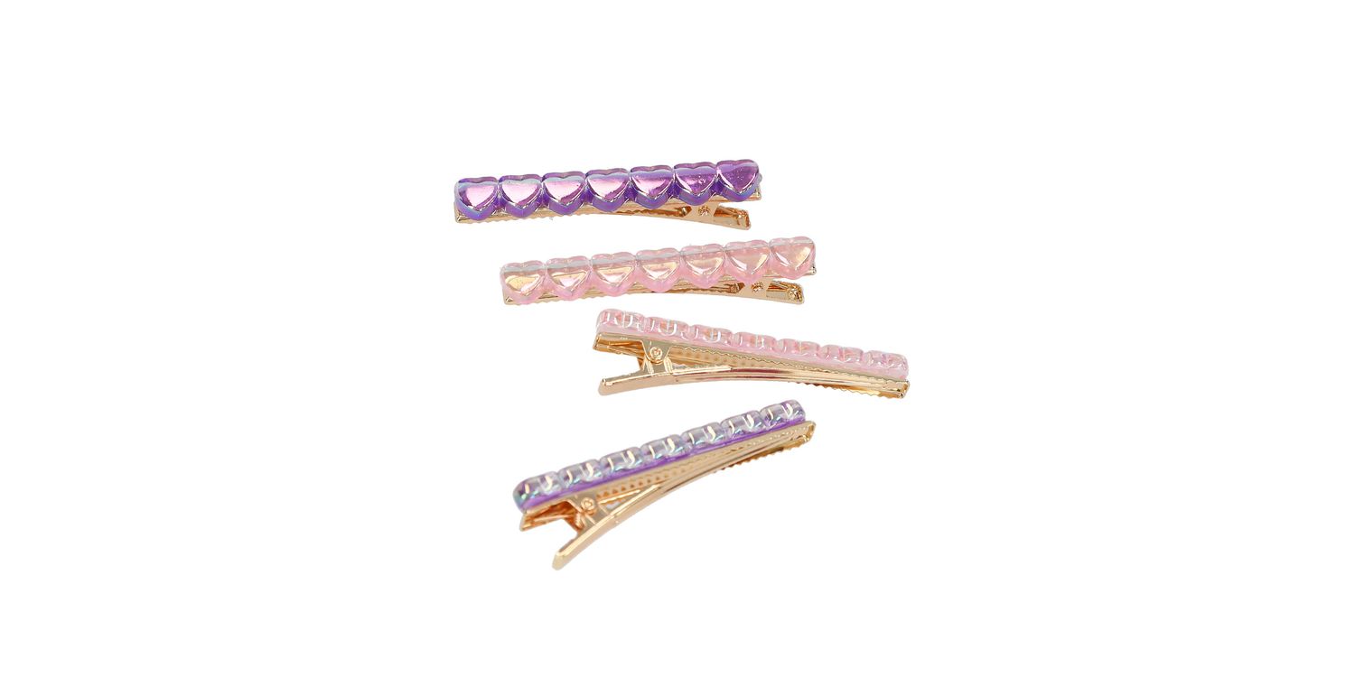 For cute hairstyles: 4 crocodile hair clips from TOPModel with 7 small hearts in a shimmering mother-of-pearl look. 2x shades of purple, 2x shades of pink, the hair clips themselves are gold-coloured.