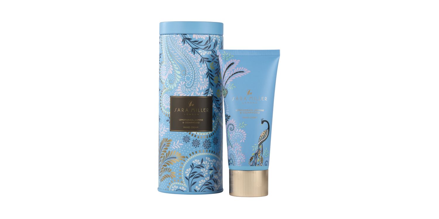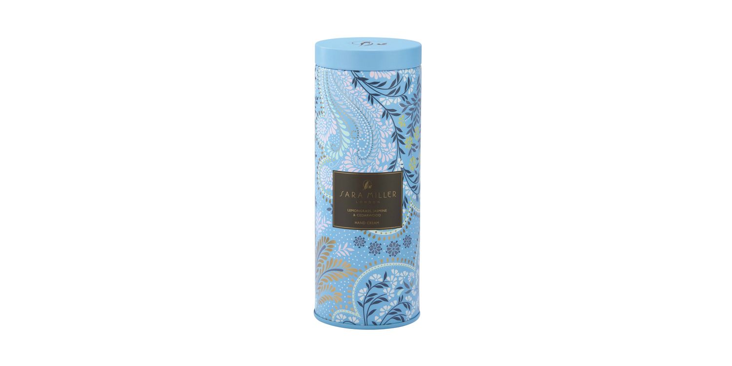 Enter the enchanting world of Sara Miller inspired by a love of travel with this luxurious and exotic, scented hand cream in matching powder blue, filigree design tin. Beautifully scented with invigorating Lemongrass, Jasmine and Cedarwood, exotic, crisp, aromatic and warm with notes of cinnamon, amber and a twist of orange. Enriched hand cream blended with skincare heroes of shea butter, mango seed butter, hyaluronic acid and gardenia flower extract leaves skin feeling velvety soft. Our Sara Miller hand cream features the elegant Blue Powder Filigree design with delicate foliage and accents of gold, finished with an exquisite gold cap. The reusable tin is ideal to repurpose for pens and pencils. A perfect hand cream gift for her.