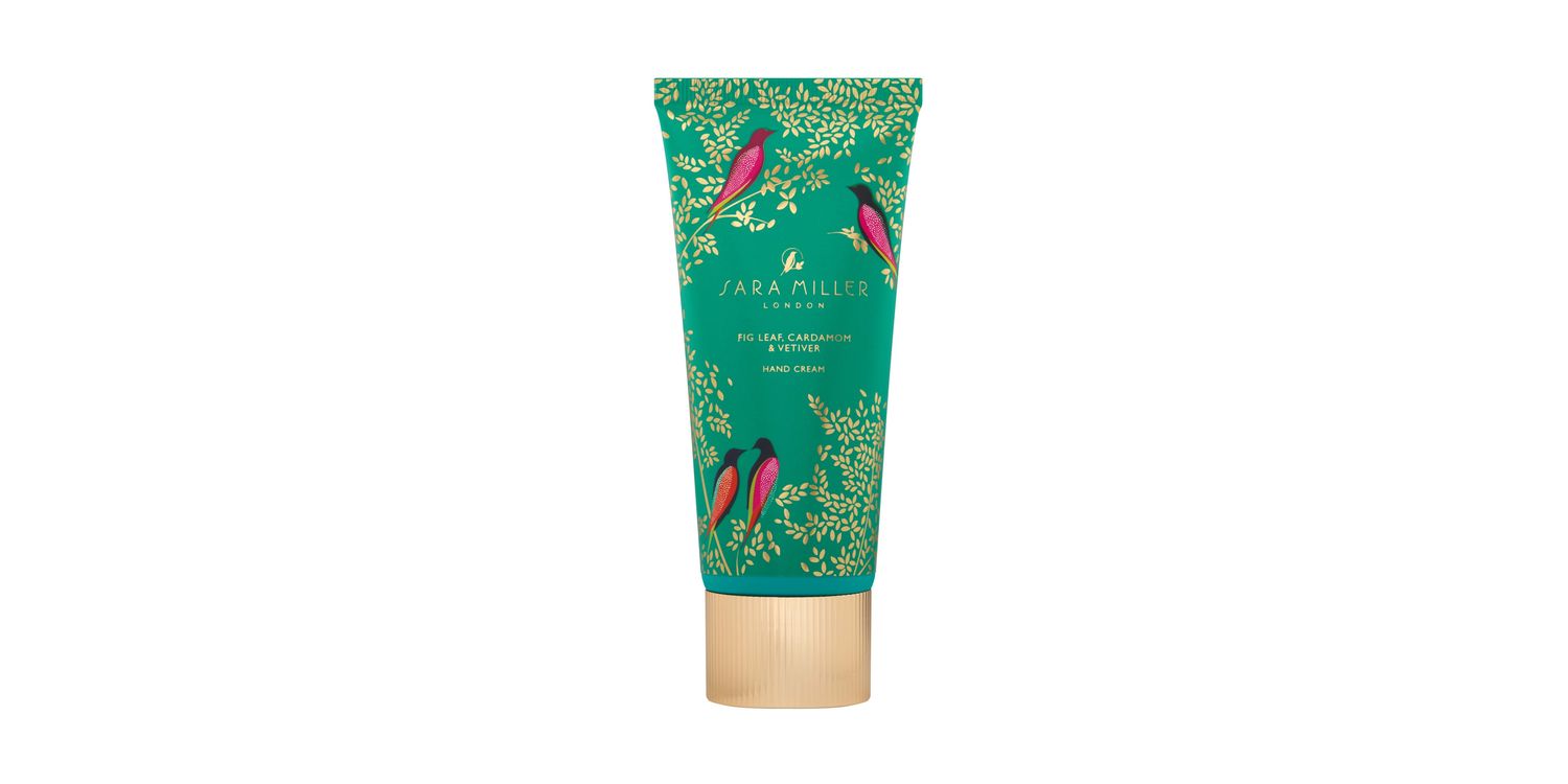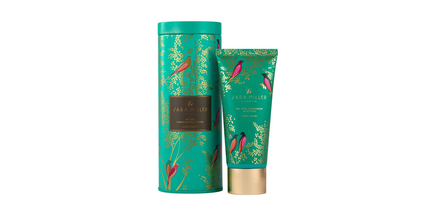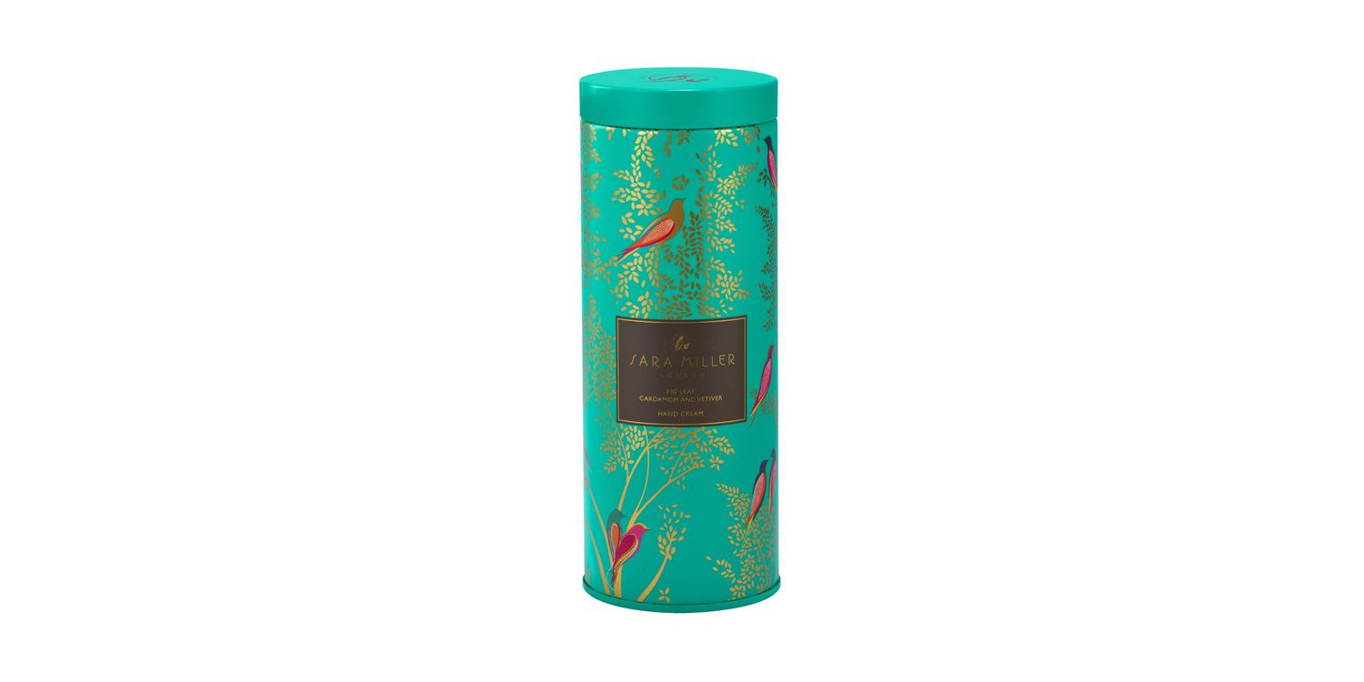 Enter the enchanting world of Sara Miller inspired by a love of travel with this luxurious scented hand cream in a beautiful green tin with exotic birds. A perfect hand cream gift for her. Scented with uplifting Fig Leaf, Cardamom and Vetiver, the enriched hand cream has glorious fresh green notes of sparkling vetiver and crisp fig leaves, hints of grapefruit, pink pepper and exotic cardamom to uplift and revitalise the senses. Blended with shea butter, meadowfoam seed oil, hyaluronic acid and extract of water mint leaf the enriched formulation leaves skin feeling silky soft. The designer hand cream features our beautiful Chelsea Bird print with birds of paradise amongst foliage with golden details and is finished with an exquisite gold tooled cap. Repurpose the tin for pens and pencils.