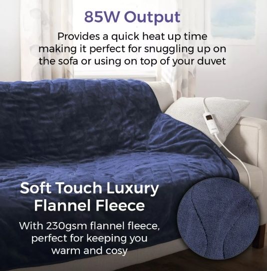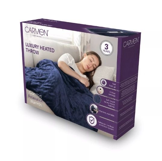 This Carmen Core Fleece Luxury Electric Heated Flow and Over Blanket features 85W output, which provides a quick heat up time making it perfect for snuggling up on the sofa or using on top of your duvet. The soft touch 230gsm luxury fleece is produced from super soft material perfect for keeping you warm and cosy. Simple and easy to use remote control with nine heat settings allows total control over the warmth of your throw, providing the perfect temperature for all your needs. The over blanket is also energy efficient and costs less than 3p per hour to run. The detachable controller lets you control the temperature and then it can be removed when the blanket needs washing. Includes overheat protection for added safety and peace of mind.