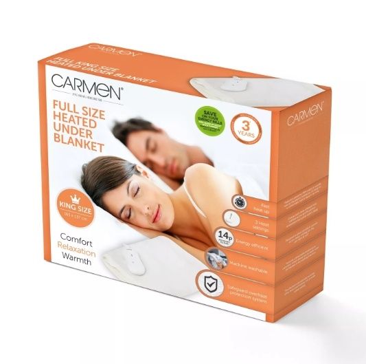 Enjoy extra warmth and cosiness all night long with the Carmen King Heated Under Blanket made from 450gsm polyester soft to touch fabric. With a powerful 80W output and choice of 3 different heat settings, the blanket heats up to your perfect temperature in no time for a comfortable night’s sleep. The blanket is efficiently designed to allow consistent warmth as you sleep. For a quick and easy clean, simply detach the temperature controller and pop the blanket into the washing machine. The blanket automatically switches off to avoid overheating and provides added safety, so you can operate it safely during the day and night.