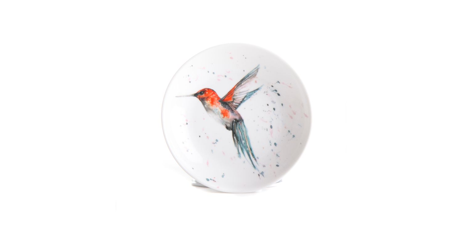 Meg Hawkins - The Rainforest Trinket Dish. Keep your cherished items safe with The Rainforest Humming Watercolour Design Small China Trinket Dish by Meg Hawkins. Adorned with stunning watercolour artwork of a hummingbird, this dish adds a touch of nature-inspired charm to any space. Crafted from fine china, it’s perfect for holding jewellery, keys, or other small treasures. A beautiful yet practical addition to your bedside table, dresser, or entryway, it also makes a thoughtful gift