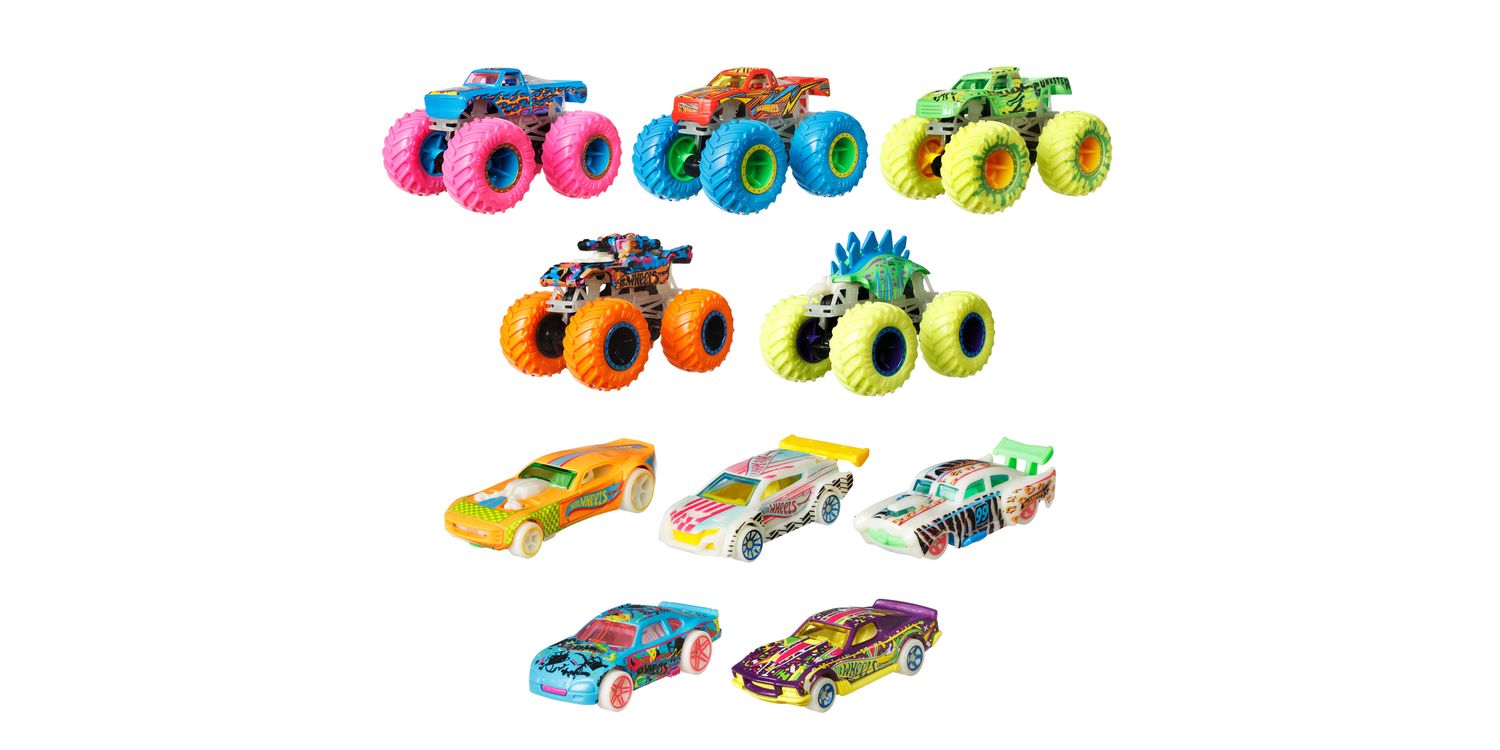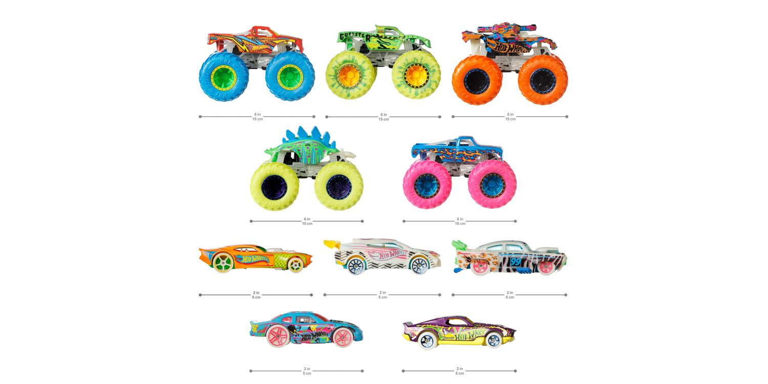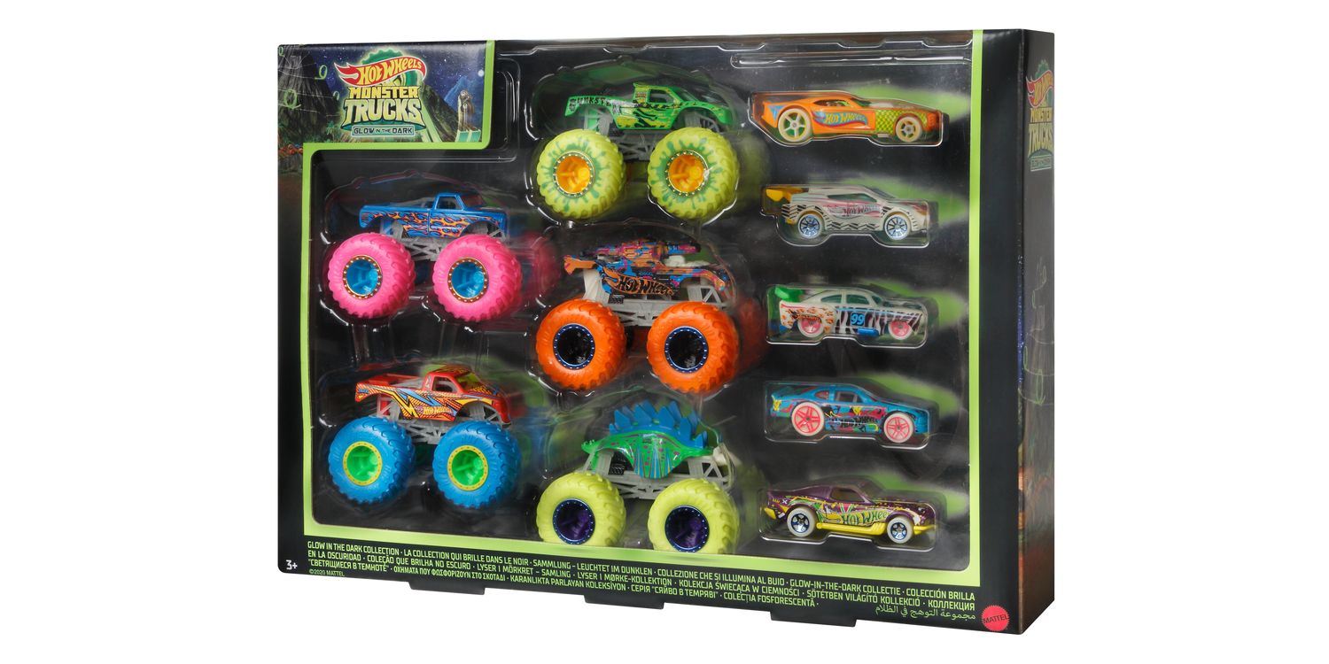 With 10 vehicles together, this set of Hot Wheels® Monster Trucks Glow in the Dark is an instant collection! Five die-cast monster trucks and five 1:64 scale die-cast cars provide endless smashing and crashing play -- with the lights on or off! Glow-in-the-dark elements bring a new edge to 'light speed.' Kids can collect other Monster Trucks vehicles and toys for even more stunting, racing and battling play! Makes a great gift for kids 4 to 8 years old, especially monster trucks fans! Colours and decorations may vary.