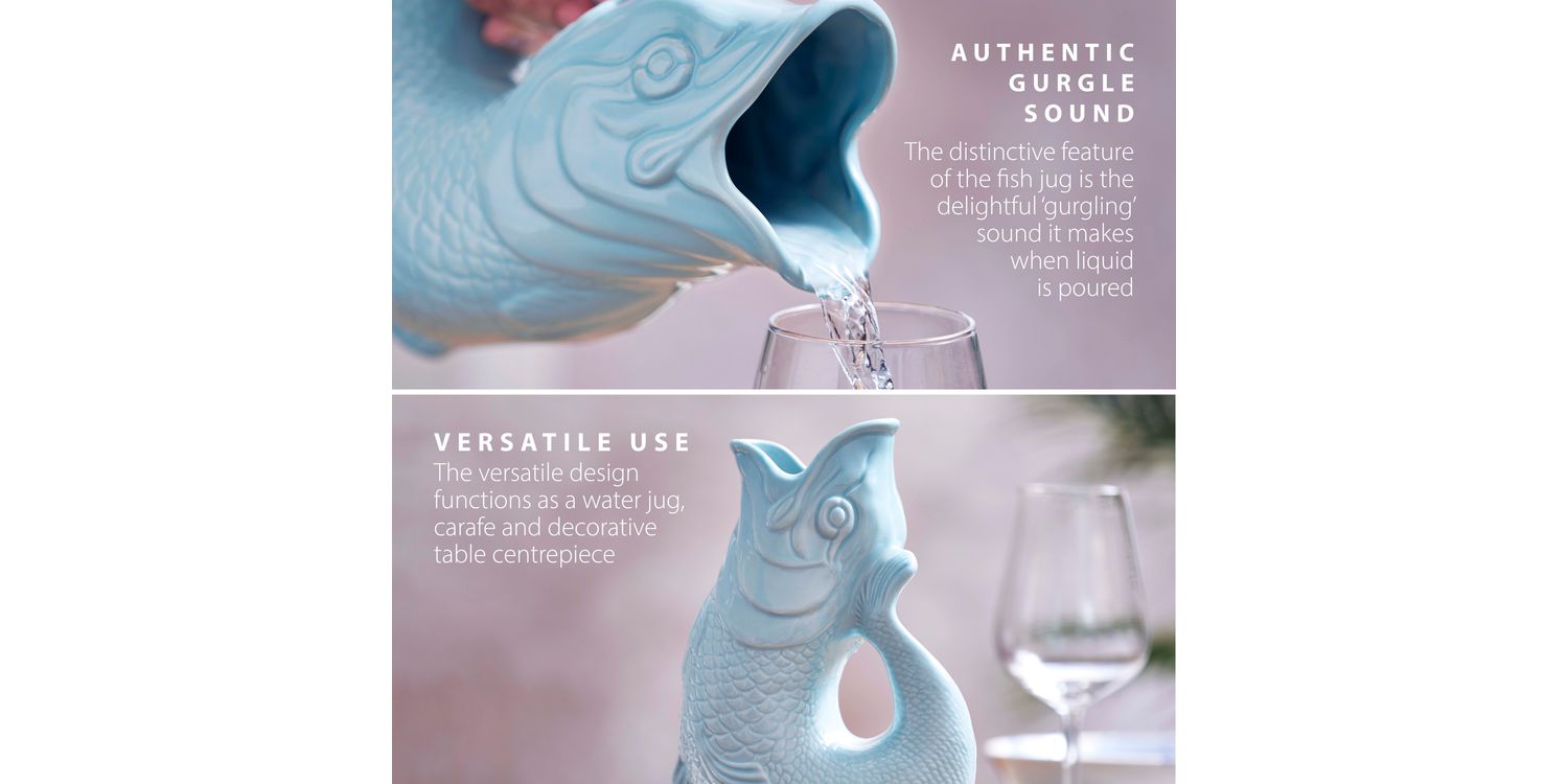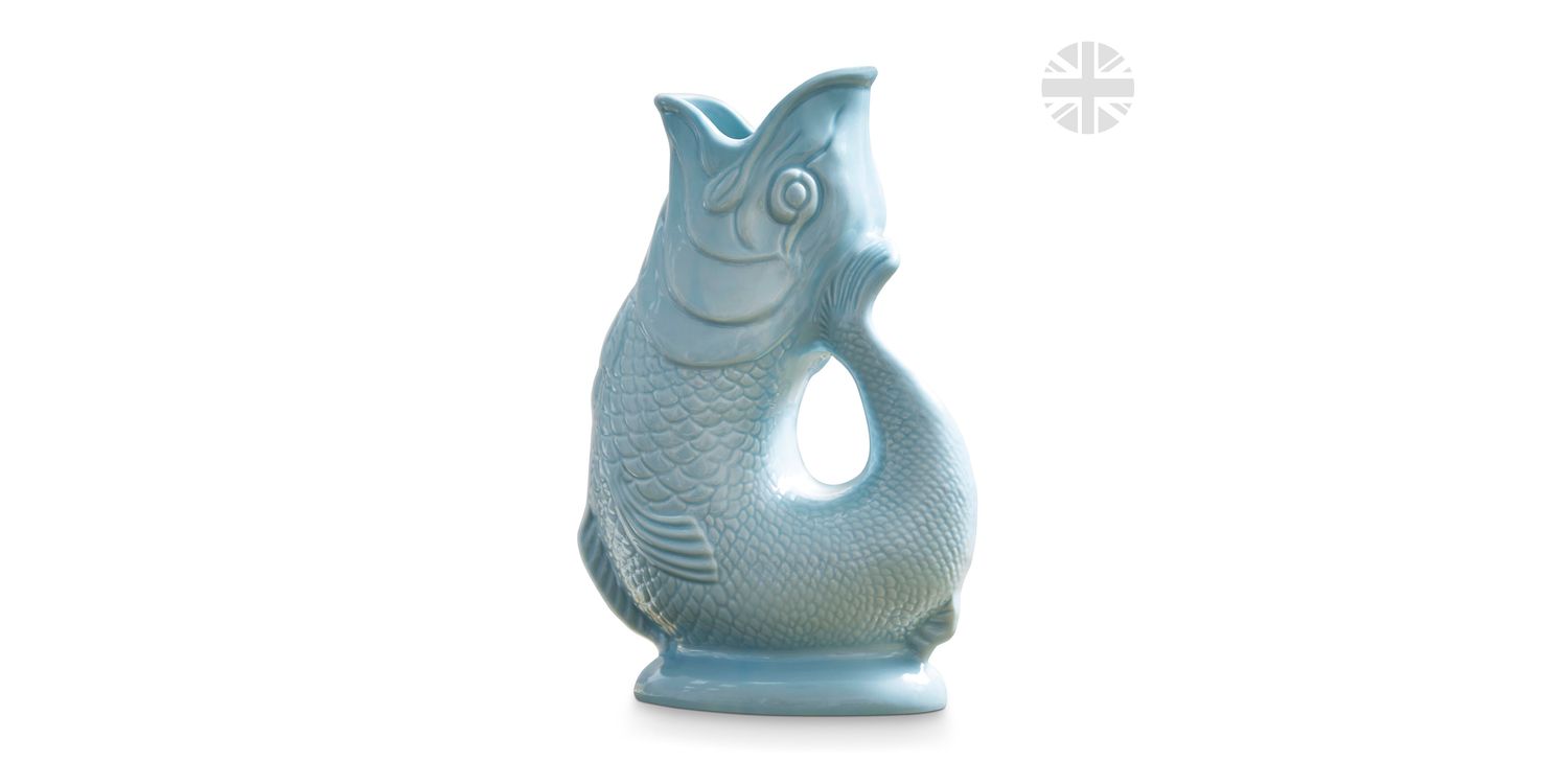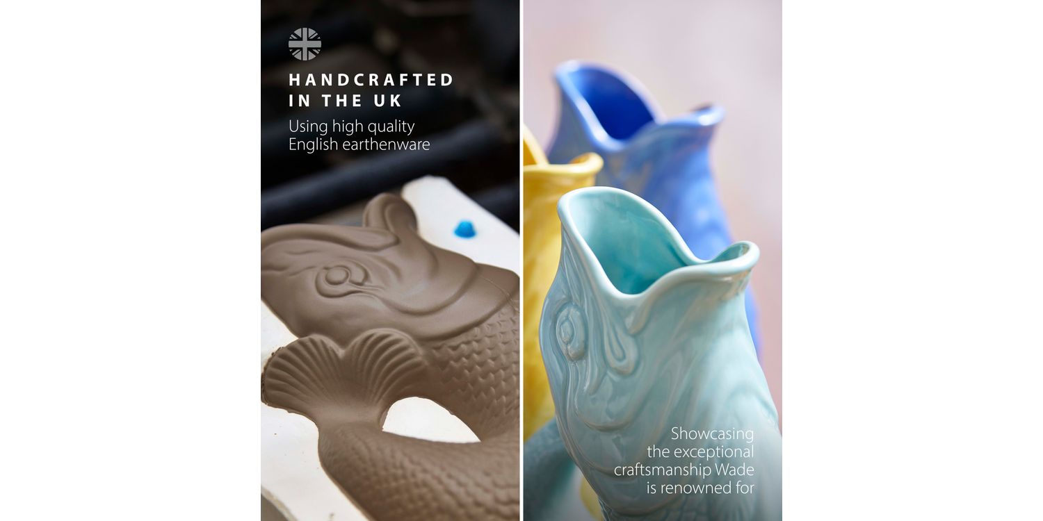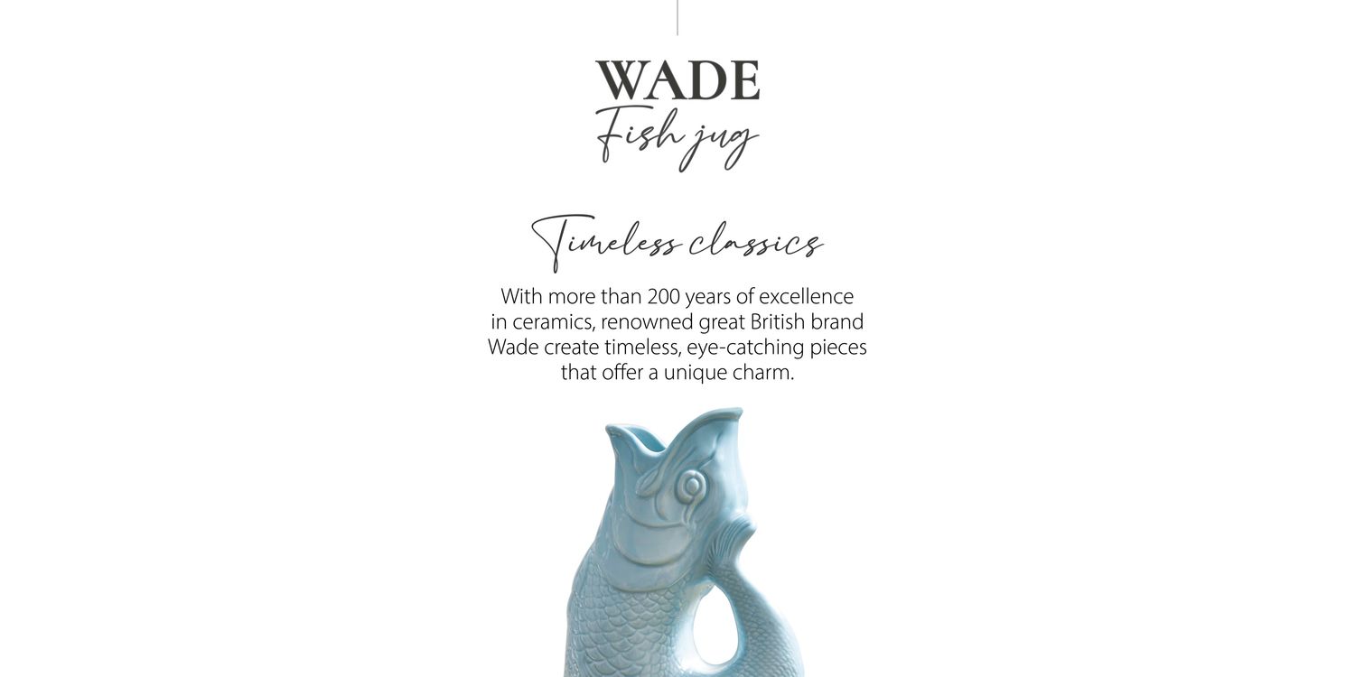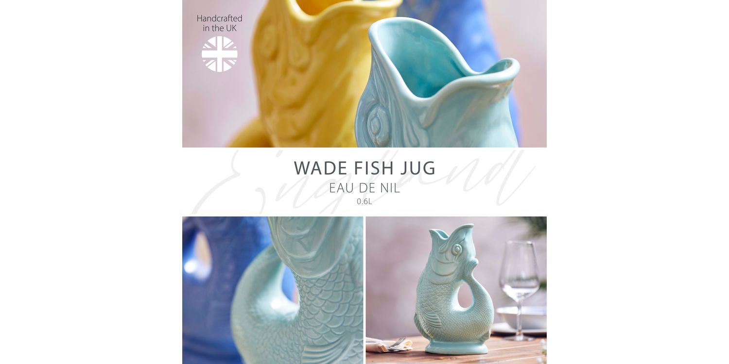 Add a touch of UK ceramic heritage to your home with this 0.6L Fish Jug from Wade. Created using the original iconic Wade design that continues to delight homes across the world for over 150 years. This fish jug is the perfect statement piece for any home. Handcrafted in Stoke-on-Trent, the heart of the pottery industry using English Earthenware, it showcases and celebrates exceptional craftmanship. The 600ml capacity means you can use it as a water jug or wine carafe at family mealtimes or social gatherings, while also being the ideal ornament, vase or table centrepiece, it just oozes style. The unique gurgling sound has long been a hallmark for the jug and it will produce the sound when pouring the jug if it is at least three quarters full. Formed in the shape of a fish, the mouth perfectly lines up to create an easy pour spout, whilst the tail curves up to create an ergonomic handle with a comfortable grip. It is the perfect gift for any heritage brand lover and would be great for weddings, birthdays and housewarming parties. Handwash is recommended to maintain the glaze and to keep the jug looking its best.