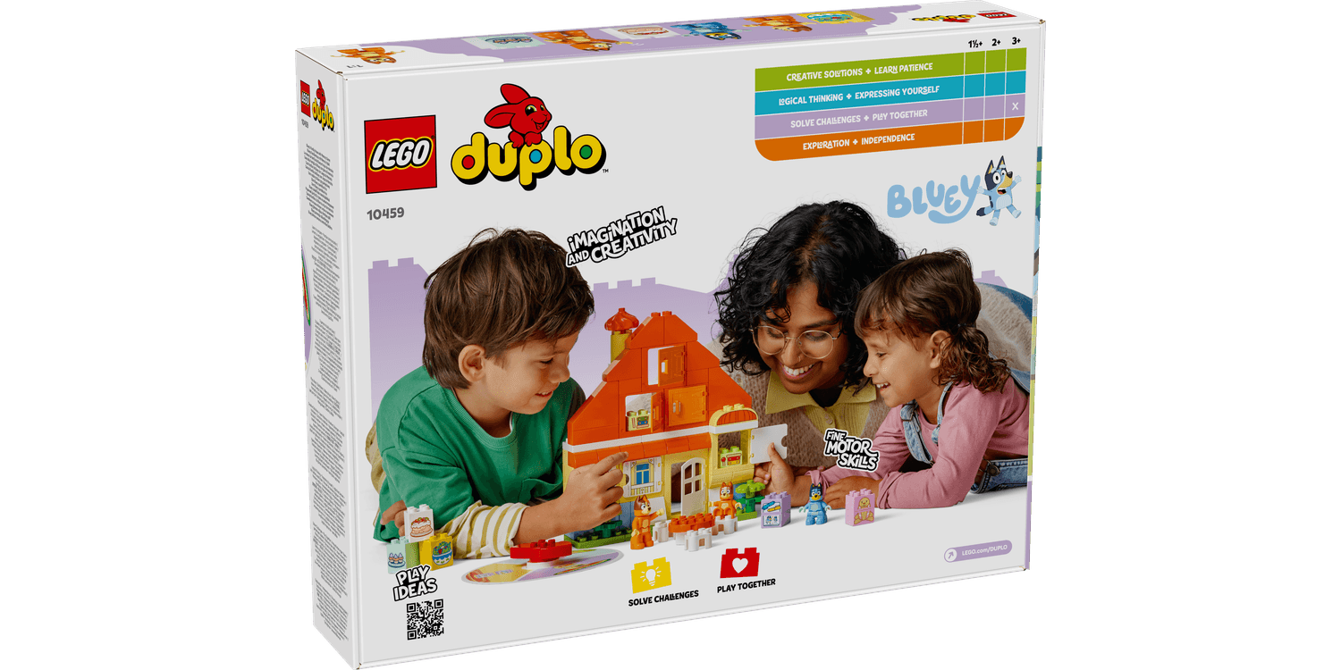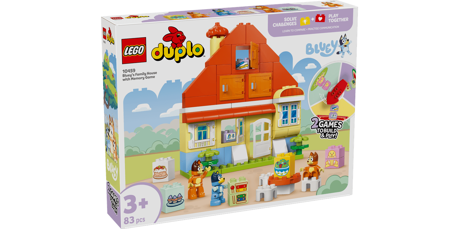 Introduce toddlers to a building set that packs in double the fun! LEGO DUPLO Bluey: Bluey’s Family House with Memory Game (10459) interactive toy for 3+ year old girls and boys delivers 2 fun activities in one colourful construction set. This fun Bluey toy is filled with lots of ways to play. Kids can simply use this adventure toy for pretend play, recreating family activities from the show with the 3 LEGO DUPLO Bluey figures – Bluey, Bingo and Bluey’s mum, Chilli – and recognisable role-play toy accessories from the Bluey TV show. Or they can play fun memory games with their families. Parents hide DUPLO bricks and Bluey figures behind the windows of the toy house, then toddlers spin the wheel to discover which pieces they need to find. They use their fine motor skills to open the toy windows and deploy their comparing, matching and communication skills to work out if they’ve found a match. Then they use their memory skills to remember where other items are hiding so they can return to them to make a match. Through pretend play, LEGO DUPLO Bluey sets let pre-schoolers and their families not only act out fun everyday activities but also help them understand how these activities make them feel. This fun building toy makes a great Bluey-themed gift for 3+ year old girls and boys.