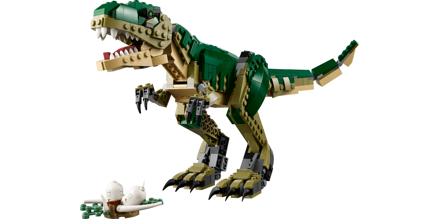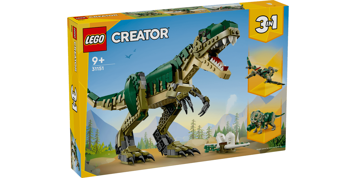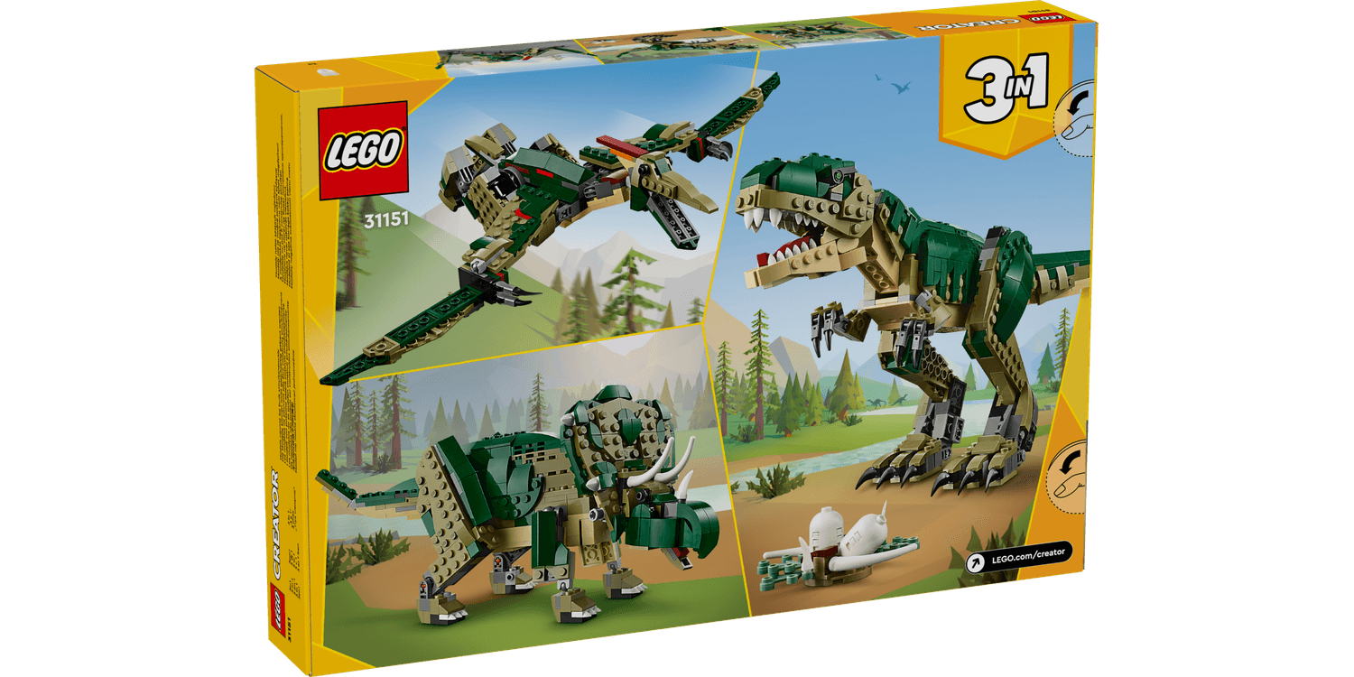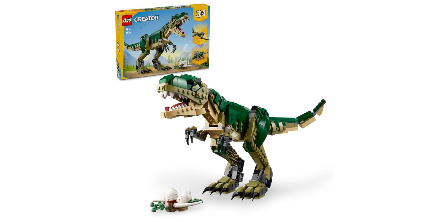 Boys and girls aged 9+ can travel back in time to play out amazing action with this T. rex (31151) dinosaur toy. The Tyrannosaurus rex toy is highly posable, so kids can move its head, feet, tail, jaw, legs, arms, and even toes and heels, into different poses. The T. rex toy also comes with a nest containing 2 small dinosaur egg elements and together they make an impressive display on a shelf or bedside table. This LEGO® dinosaur toy building set gives kids a world of exciting play possibilities with 3 different dinosaur toys to build using the same bricks. They can create a posable T. rex, rebuild it into a fearsome triceratops with 3 horns, or turn it into a pterodactyl with large movable wings. LEGO Creator 3in1 toy building kits make great birthday or Christmas gifts for kids with 3 options to create in every box. 3in1 sets offer a range of brick-built models that appeal to kids’ biggest passions, including cool vehicles, amazing animals and detailed city scenes.