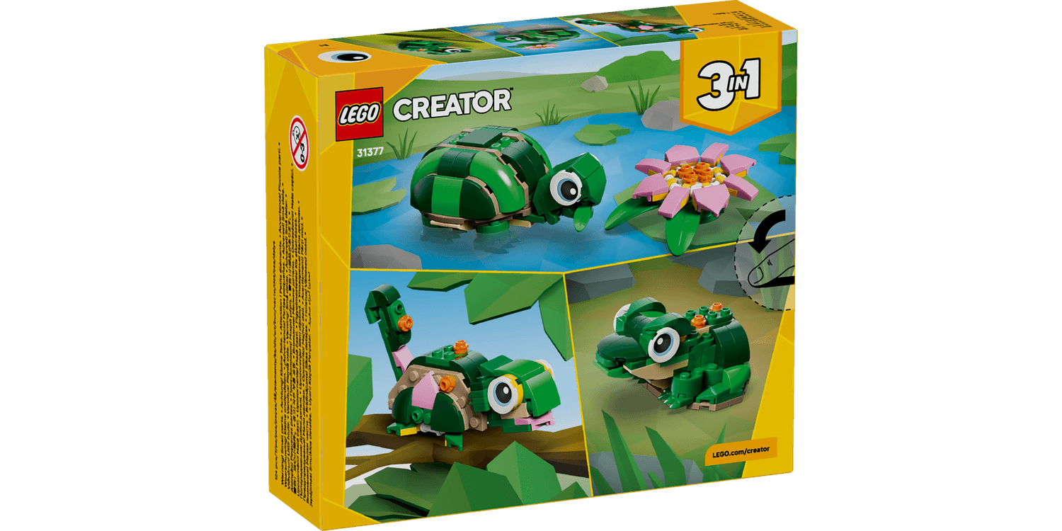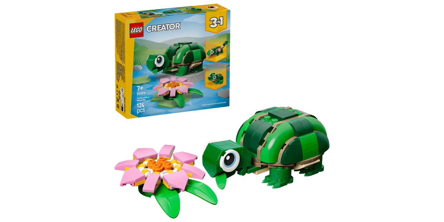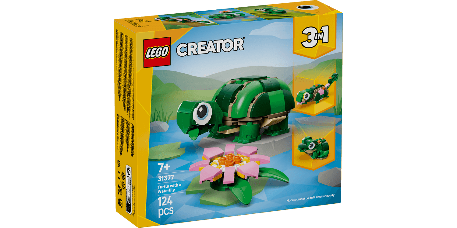 LEGO Creator 3in1 Turtle with a Water Lily Flower (31377) building toy for 7+ year old girls and boys, lets kids play out creative stories with cute animal figures.