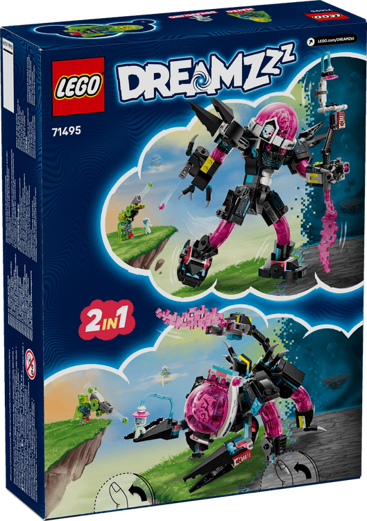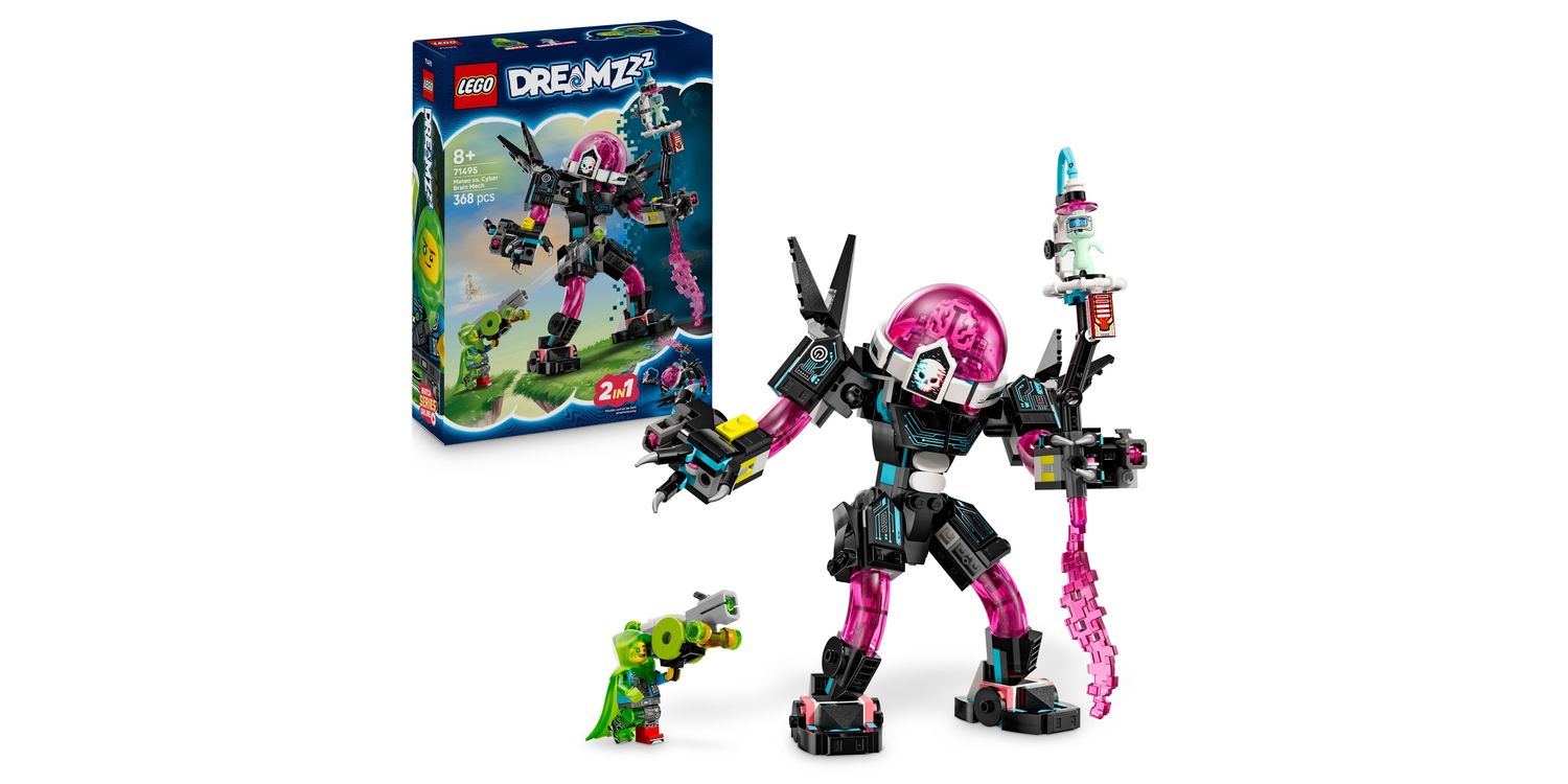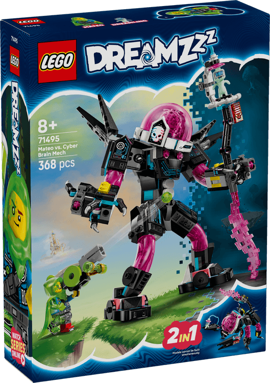 Unlock imaginations with this thrilling LEGO DREAMZzz Mateo vs. Cyber Brain Mech (71495) building toy for 8+ year old boys and girls. Offering 2 building adventures, this creative toy lets fans team up with Mateo to save an innocent Dreamling from the Cyber Brain. With this LEGO DREAMZzz set, young dreamers will have fun building a colourful capsule before rebuilding it as a Cyber Brain mech toy or a Cyber Brain scorpion mech. Packed with cool details, the robot toy building set includes stud shooters, a mega goo shooter cannon, an opening cockpit and modular shooters that are compatible with other building sets in the 2025 LEGO DREAMZzz collection (sold separately). A Mateo LEGO minifigure, who wears Z-Blob as a protective cape, and a Dreamling figure bring the set to life and spark imaginative role play. An awesome gift for 8+ year old boys and girls, this building set includes story-led building instructions that let kids immerse themselves in adventure and become dream-world heroes.