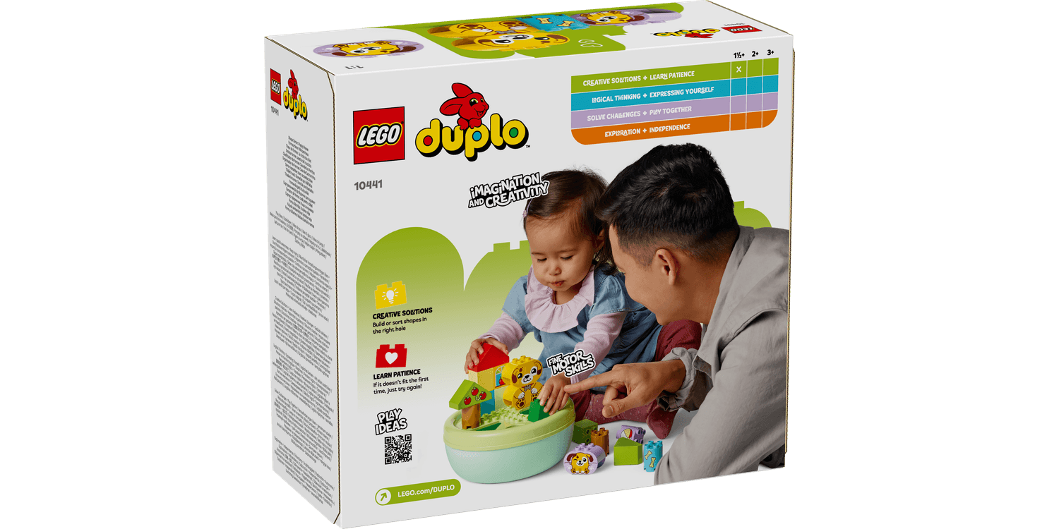Give pooch-loving pre-schoolers two ways to play with the LEGO DUPLO Shape Sorter Puppy House (10441) toy for 18 month old girls and boys. This fine motor skills toy introduces joyful learning about shapes and problem-solving as pre-schoolers use the DUPLO bricks to build a place for their pups to play, then drop the shapes through the holes in the lid. This toddler learning toy is packed with fun family learning activities. Parents can point out all the different shapes in the set as toddlers use them to build trees, animal toy figures and even a house. They can then enjoy creative role play with their cute LEGO DUPLO dogs, rolling a ball for them and feeding them a bone. When the imaginative play with the educational toy is done, the shape-sorting fun begins. Little ones will learn patience and focus as they figure out the right shape to fit each hole. And if they get it wrong, they'll build perseverance and hand-eye coordination as they try again to find the correct hole for their toy shape. This sorting toy makes a great gift for 1.5+ year old girls and boys. Check out other LEGO DUPLO sets (sold separately) for more fun ways for your child to learn and play with colourful building bricks.