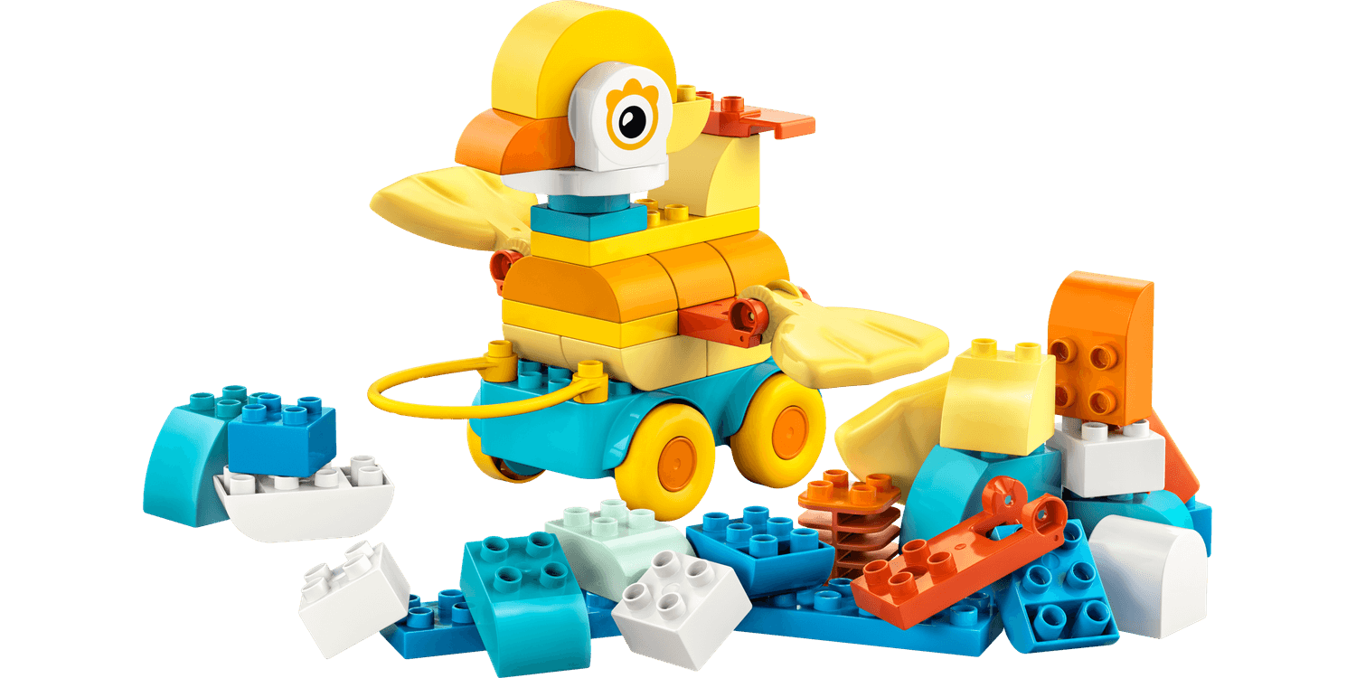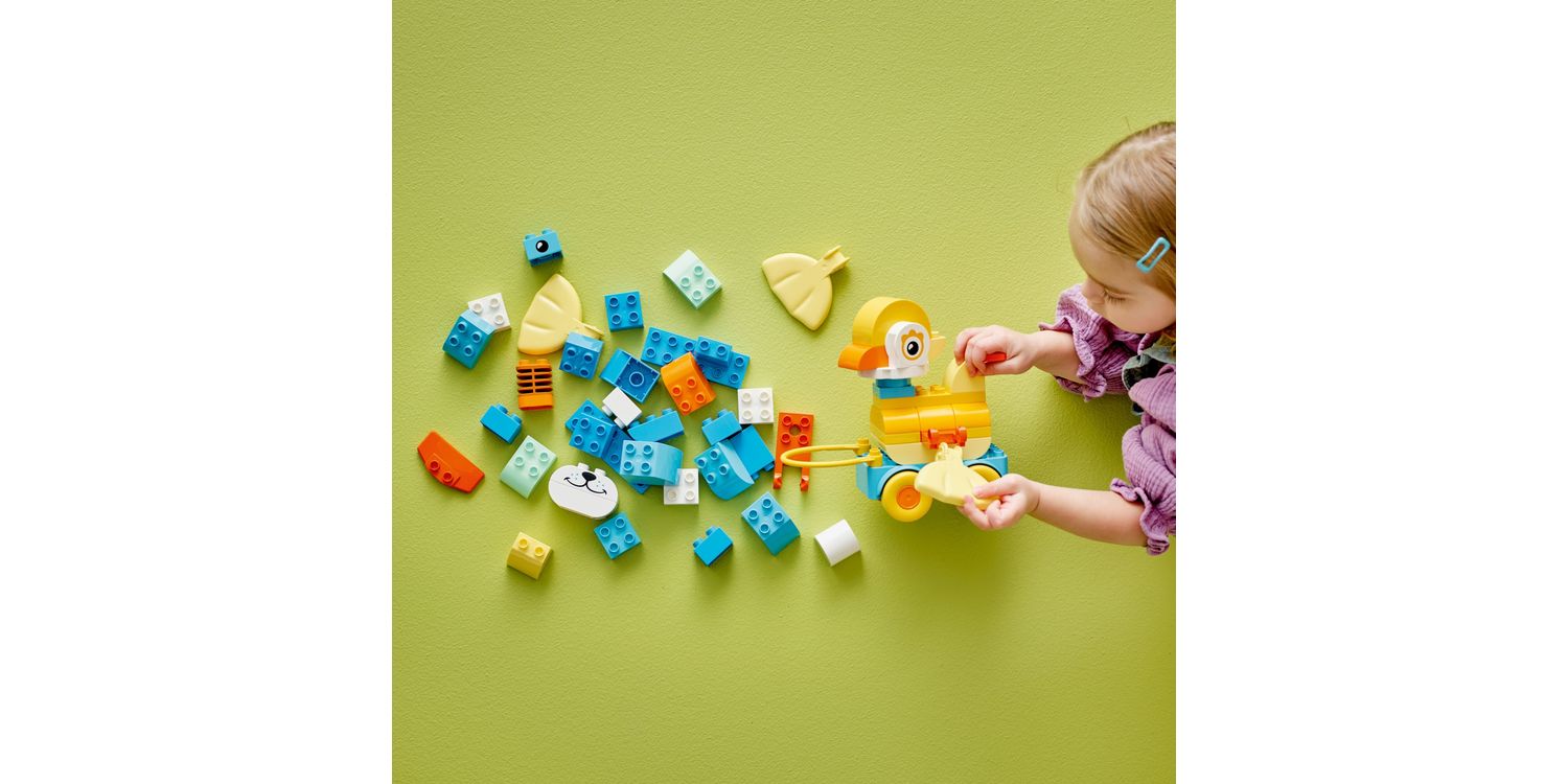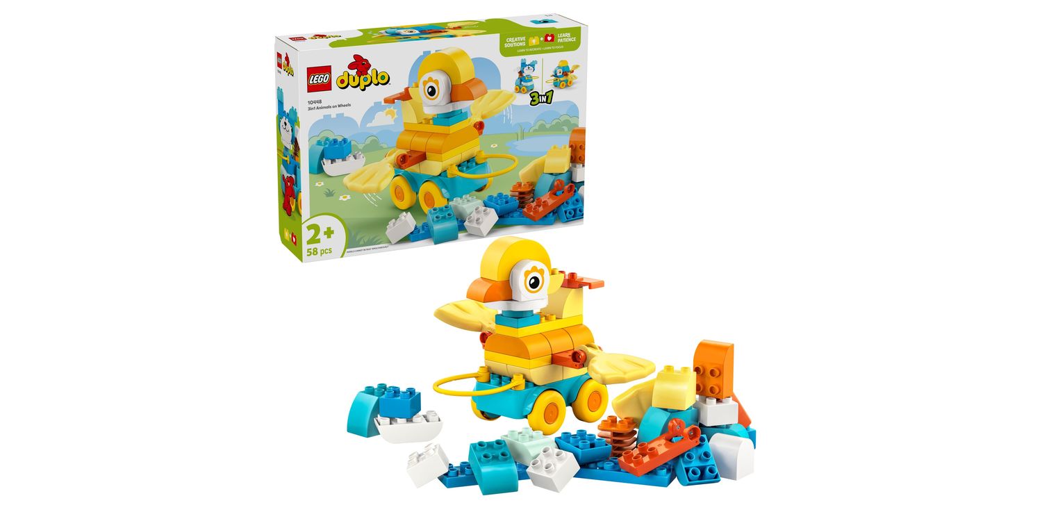 Boost young kids' creativity with the LEGO DUPLO 3in1 Animals on Wheels (10448) toddler learning toy for 2+ year old girls and boys. Little animal lovers will find countless ways to enjoy imaginative play as they use DUPLO bricks to build the duck, fish or dog animal toys, or even create all-new animals! Preschool kids who love LEGO DUPLO toys can build their animal figures on a wheelbase and can enjoy sending them zipping along or pulling them along with the handle. This gift for 2+ year old girls and boys has moving features such as a flexible tail piece and hinged toy elements that will appeal to toddlers' sense of fun while honing their fine motor skills. Little ones use their focus, perseverance and imagination as they endlessly build and rebuild their creative animal toys. This educational toy has many playful learning moments. It comes with easy-to-handle DUPLO bricks that are simple to pull apart, making it straightforward for toddlers to learn how to balance the wheelbase to save their creation from tipping over.