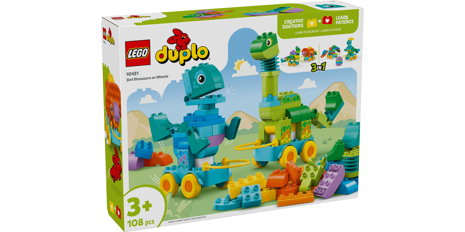 Bring big fun to the playtimes of little builders with the LEGO DUPLO 3in1 Dinosaurs on Wheels (10451) toddler learning toy. Packed with creative play possibilities, this learn-through-play dinosaur toy comes with a range of colourful LEGO DUPLO bricks to create 3 pairs of fun models. The 108 bricks and pieces in this LEGO DUPLO animal toy set assemble in 3 different ways as Diplodocus and T. rex toys, Triceratops and Stegosaurus toys or Pteranodon and Parasaurolophus dinosaur figures. Toddlers can add fun to their dino toys by giving them a moving neck, articulated tail, flapping wings or mouths that open and close. Preschool kids build their dinosaurs on a wheelbase, making this a great gift for 3+ year old boys and girls who love LEGO DUPLO playsets. This 3in1 educational toy has lots of opportunities for playful learning. It comes with easy-to-handle LEGO DUPLO bricks that are simple to pull apart, teaching toddlers perseverance, focus and imagination skills as they endlessly build and rebuild their creative toy animals.