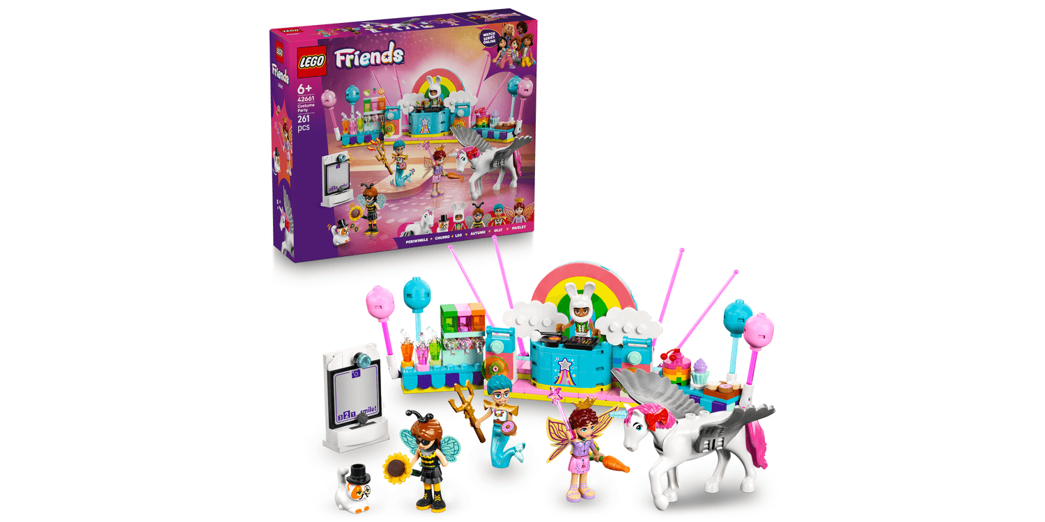 Here’s a kids’ building set packed with storytelling inspiration. The LEGO Friends Costume Party with Unicorn & Fairy (42661) toy for 6+ year old girls and boys comes with 4 LEGO Friends mini dolls, a cat figure and a horse figure. It also features lots of cute party accessories for pretend play. With this creative toy, kids can create their own fun stories and act out social situations as the friends try on their costumes. Autumn is dressing up as a bumblebee and Olly is a merman. Churro the cat joins in the fun in a magician costume with Leo as his white bunny. Paisley wears a fairy costume and Periwinkle the horse transforms into a unicorn toy. The friends enjoy a party with a stage, DJ booth and snacks. There’s also a photo booth with fun accessories where the friends can pose for pictures. This building set comes with the LEGO Builder app for intuitive building. Here kids can zoom in, rotate models and track progress as they build. Discover more fun building toys (sold separately) in the LEGO Friends universe. This set makes a great birthday gift for 6+ year old girls and boys.