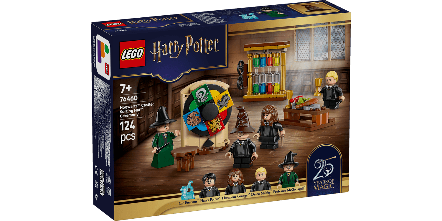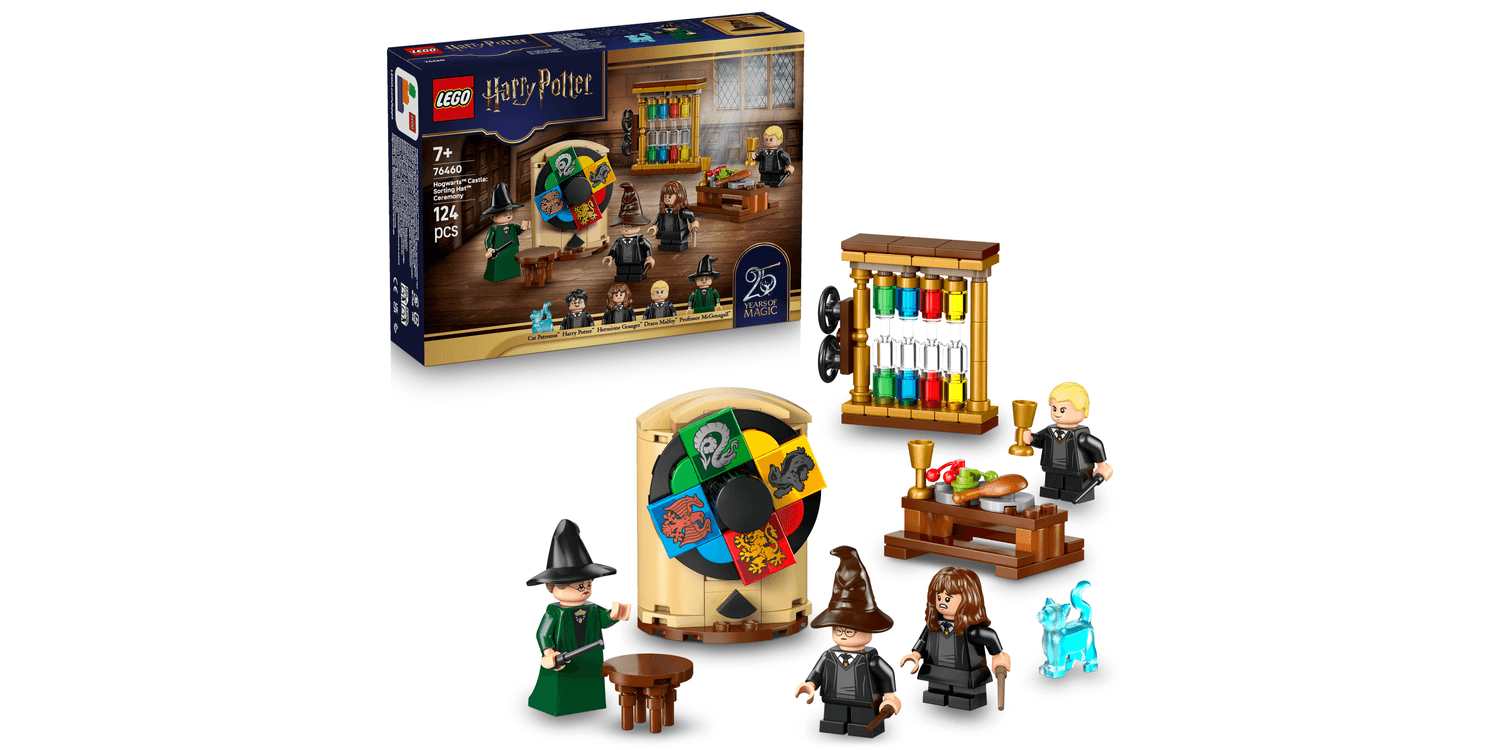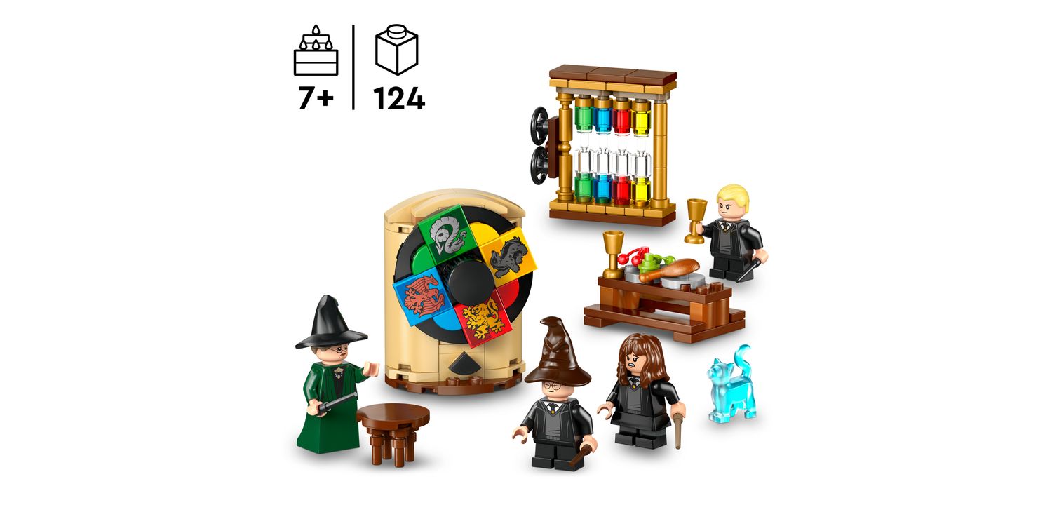 A fun Harry Potter toy gift for boys, girls and any fans aged 7 and over, it features 4 LEGO Harry Potter minifigures: Professor McGonagall™, Harry Potter, Hermione Granger™ and Draco Malfoy™. Place the Sorting Hat on each student and spin the ‘sorting wheel’ to discover which Hogwarts house they will join. A dinner table and house points counter add to the play possibilities. This kids’ adventure kit pays tribute to the first-ever LEGO Harry Potter set (4701), released in 2001, and features one in a series of 25th anniversary collectable Patronuses: Professor McGonagall’s Cat Patronus™. This set fits inside Hogwarts Castle: The Great Hall (76435), another in the collection of modular building toys (all sold separately), which together create the most detailed LEGO brick-built Hogwarts Castle scene to date.