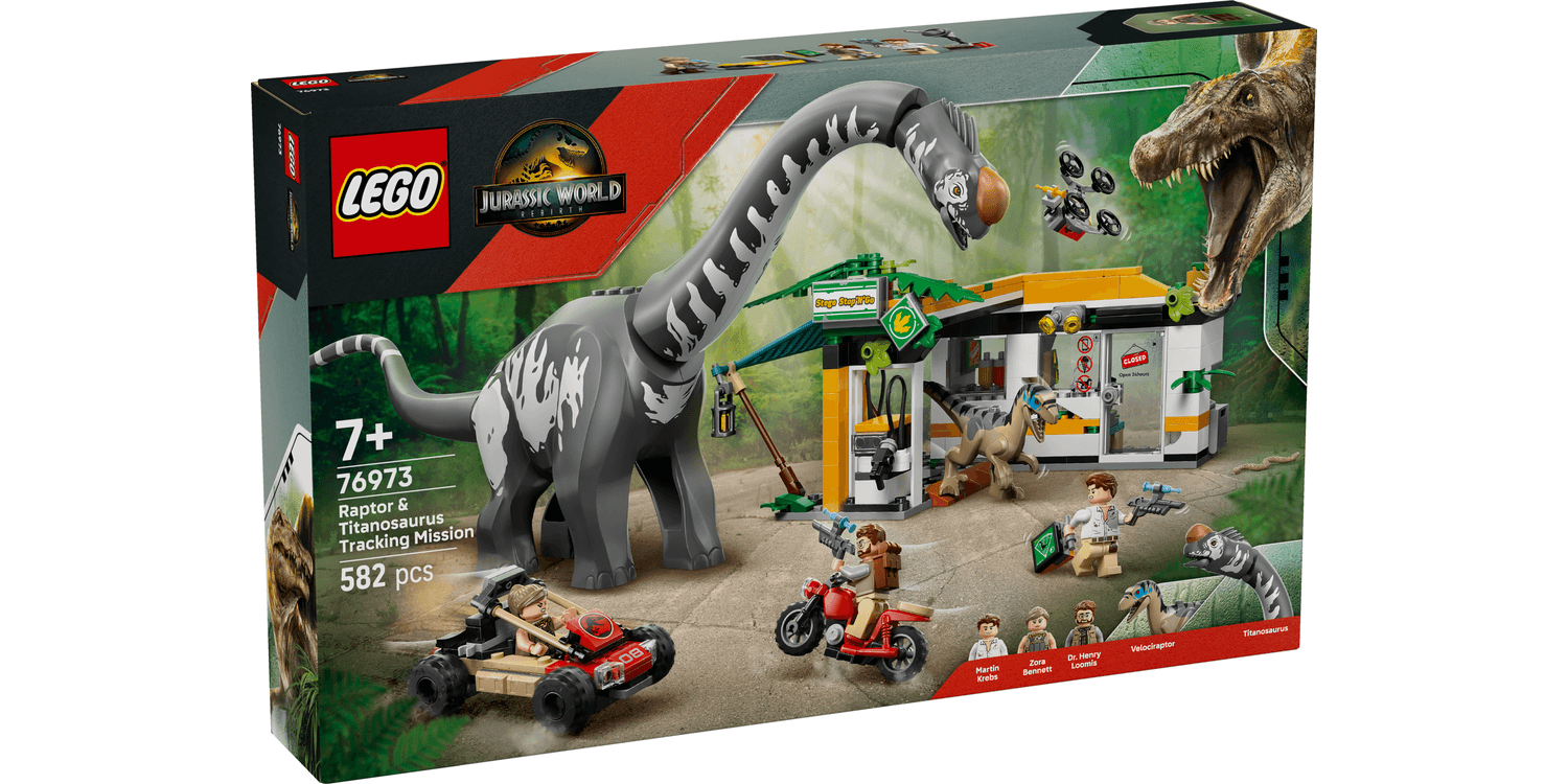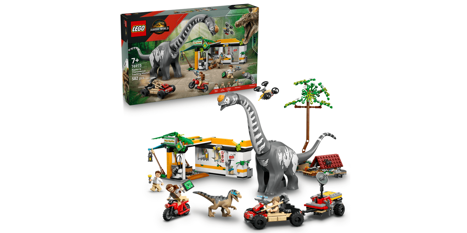 Thrilling chases and action await kids and film fan in this LEGO Jurassic World Raptor & Titanosaurus Tracking Mission (76973) building toy for 7+ year old boys and girls. The dinosaur toy building set features moulded Titanosaurus and Velociraptor toy figures and 3 LEGO minifigures: Zora Bennett, Martin Krebs and Dr. Henry Loomis. The Velociraptor dinosaur figure has a moving jaw and the Titanosaurus has a movable neck, head and tail. The interactive toy includes a charging station, an off-road vehicle with a trailer, a syringe case with 3 syringes, a motorbike toy, buildable drone, camp area with falling tree function and more. The building set is easy to take out for playdates and makes a great choice for kids who love adventures and dinosaur toys. This set also works with other LEGO Jurassic World sets (sold separately), and the LEGO Builder app guides young fans on an intuitive building adventure, letting them zoom in and rotate models in 3D, save sets and track progress. Set contains 582 pieces.