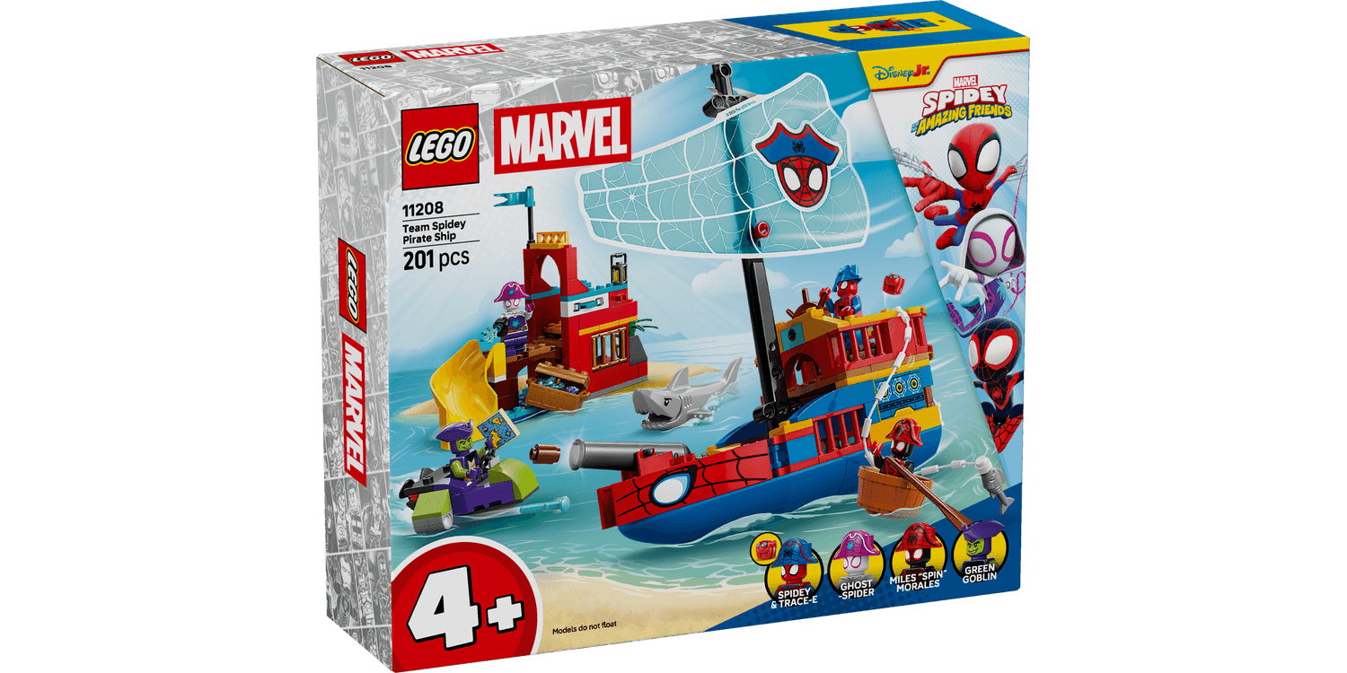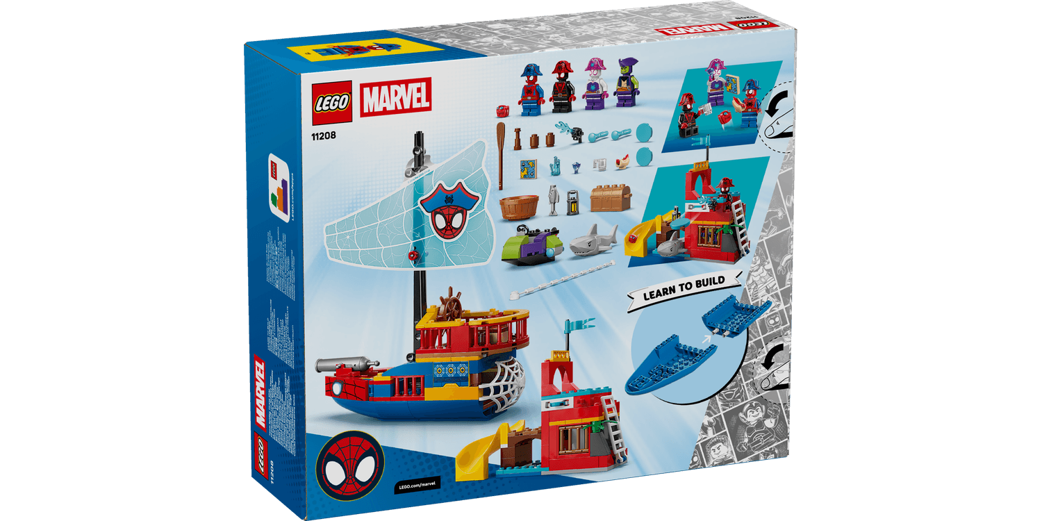 Set sail for imaginative play aboard the Team Spidey Pirate Ship (11208) creative building toy with Spidey, Green Goblin, Ghost-Spider and Miles "Spin" Morales. This building set offers a great way for boys, girls and kids aged 4 and over to develop skills as they explore fun at sea and on Spider Island.