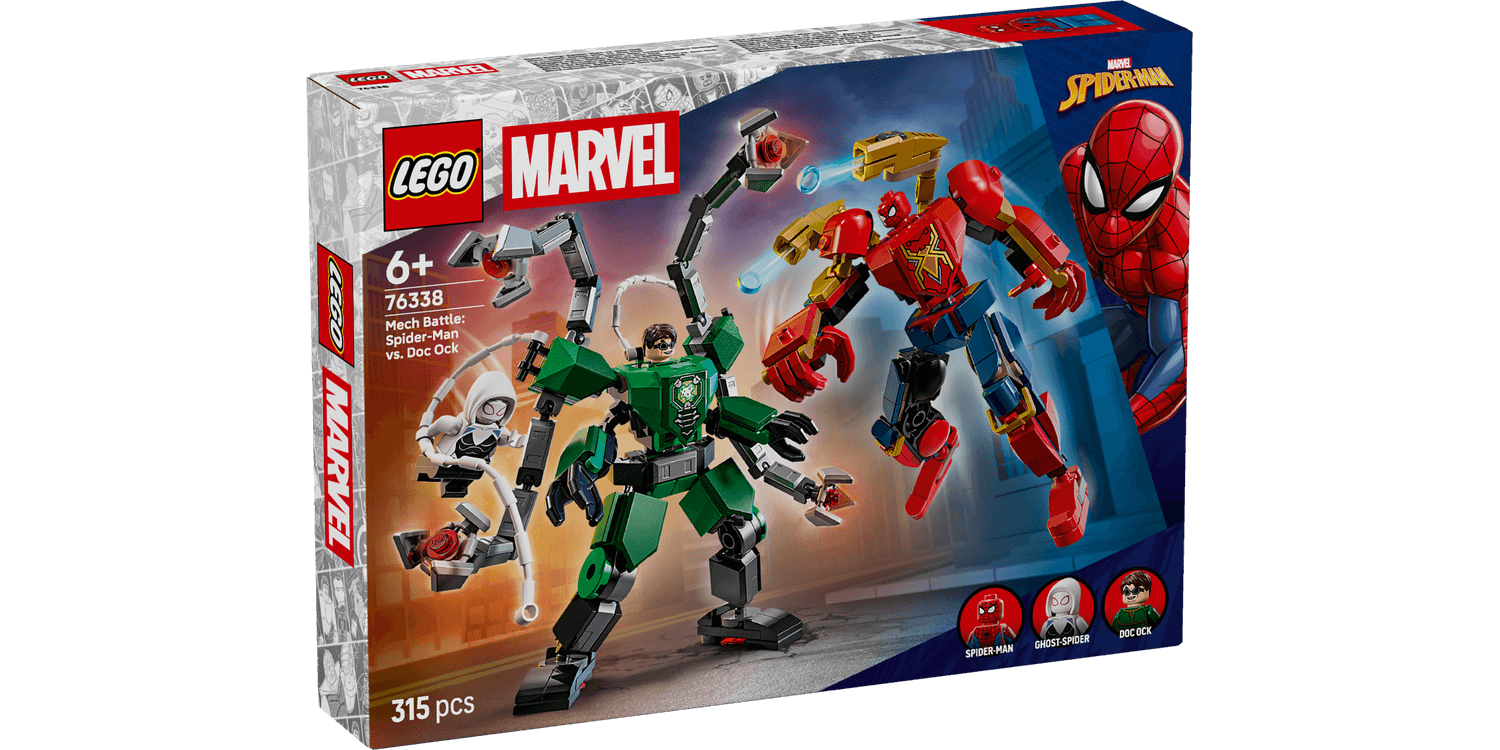 Join 2 fully jointed mechs for supersized Super Hero action with Mech Battle: Spider-Man vs. Doc Ock (76338), a building toy gift for boys and girls aged 6 years old and over.