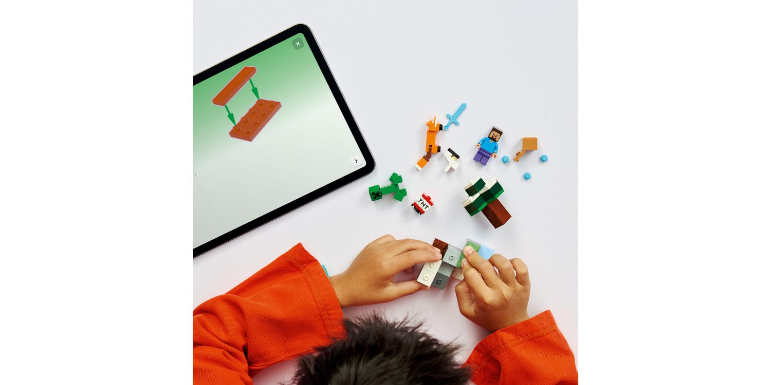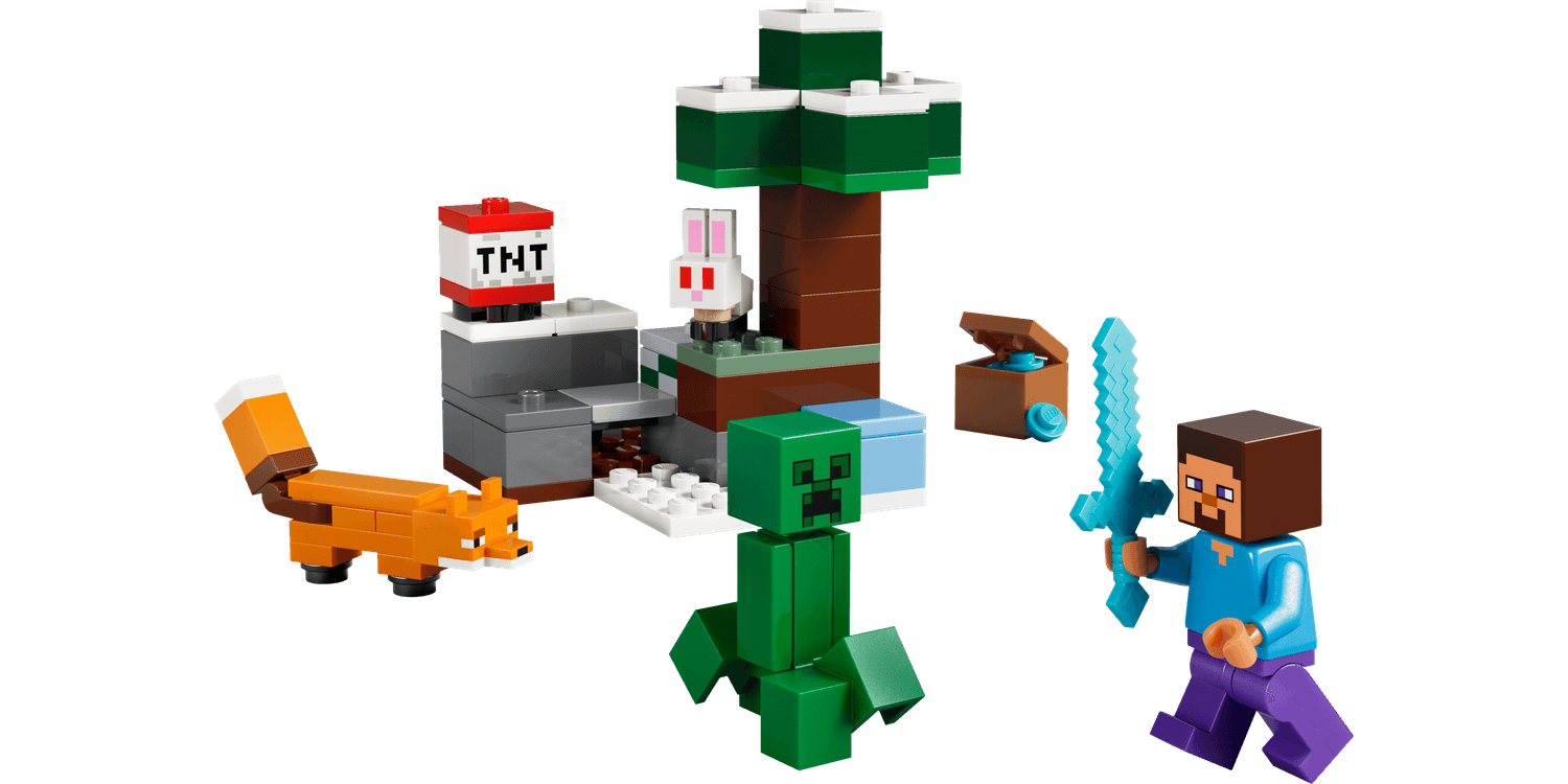 This small LEGO® set is bursting with battle action, treasure hunting and explosive fun for kids to explore with a Steve minifigure, plus Creeper™, fox and baby bunny LEGO figures. Kids join one of the game's heroes, Steve, as he mines diamonds in the Minecraft taiga biome, with its distinctive spruce tree, snow and taiga grass. TNT and an explosion function blast the rocks apart to reveal diamonds, which can be stored in a treasure chest. There’s also a hostile Creeper to fend off using Steve’s diamond sword. This set makes a great gift idea for Minecraft players, LEGO builders and fans of gaming décor. And, with the LEGO Builder app, kids can build with confidence – zoom, rotate in 3D and track progress with easy-to-follow digital instructions. .