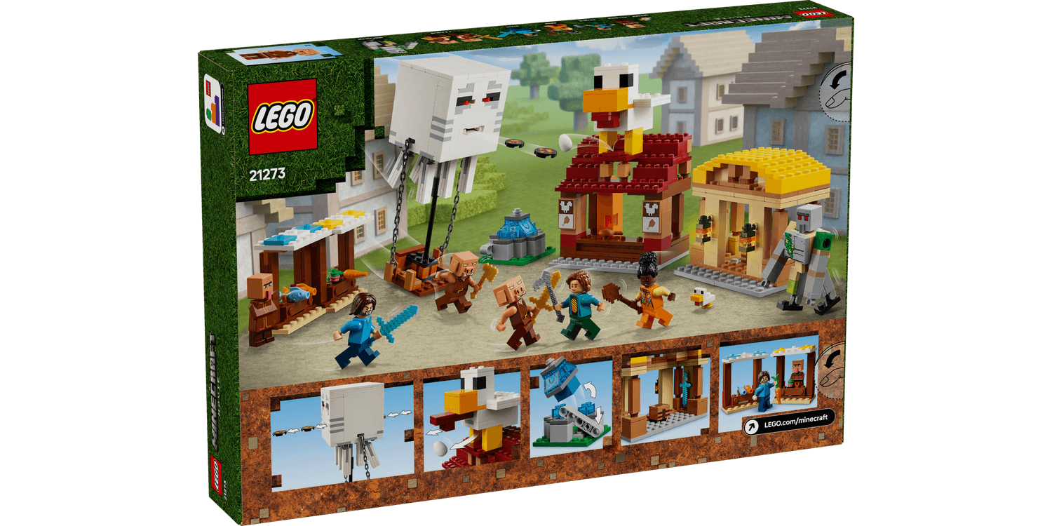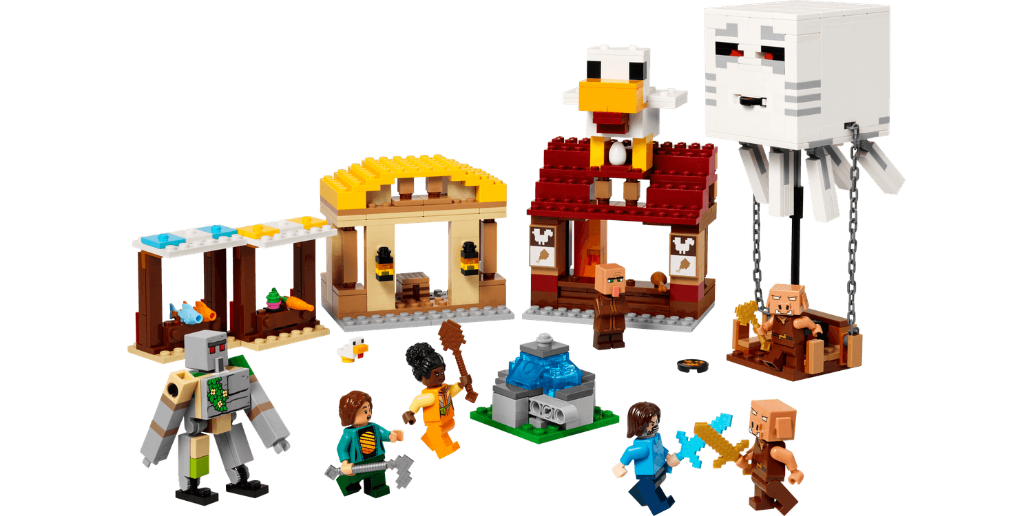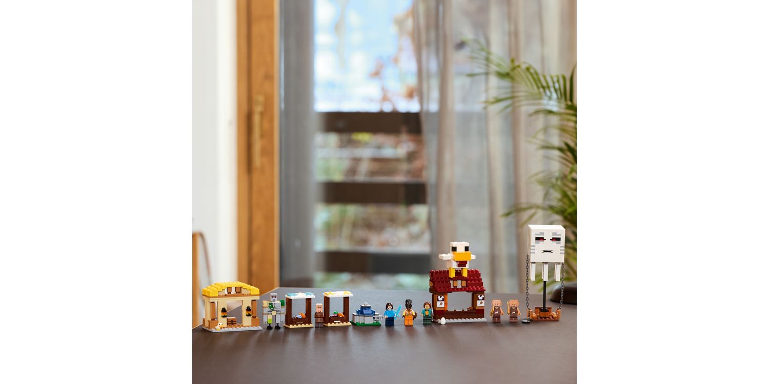 The set features popular characters from the video game: Steve, Natalie, Dawn, 2 piglins, a ghast balloon (over 18cm high), villager, baby chicken and a posable iron golem figure. The balloon has room for the piglins and incorporates a disc shooter. Set amongst the village are market stalls, Steve's fried chicken restaurant, his crafting shack and a fountain, which kids can ‘explode’ using a built-in feature. The restaurant’s roof is topped with a large chicken model that includes a fun egg-laying function.