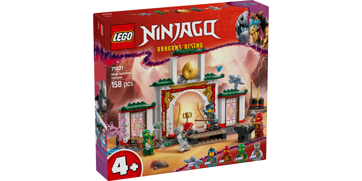 Delight ninja toy-loving kids with the LEGO NINJAGO Ninja Spinjitzu Temple (71831). This dragon toy playset for 4+ year old boys and girls lets kids recreate adventures from season 3 of the NINJAGO Dragons Rising TV show. This role-play toy is ideal for pretend play with a NINJAGO tournament stage, garden, teahouse and weapons training area. This LEGO NINJAGO set comes with 4 minifigures: Zane, Nya, Kai and Lloyd, plus a Baby Riyu dragon figure so kids can role-play ninja action. The LEGO NINJAGO minifigures can be placed on 2 turning plates for epic battles, and for added play value there is a large range of accessories: ninja weapons including 2 swords and 3 staffs, as well as a hammer, bird, frog, trophy, biscuit and letter. This LEGO 4+ ninja toy has been designed to provide a fun experience for children who are discovering the joy of building with LEGO bricks. The adventure toy comes with a Starter Brick – a partly constructed base that gets kids building quickly and with confidence and makes a great birthday gift for 4 plus year old boys and girls.