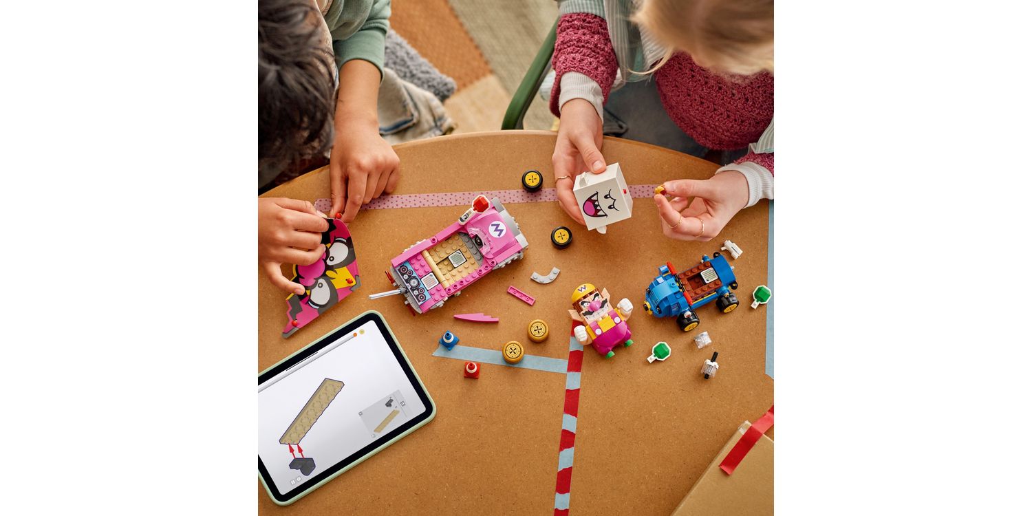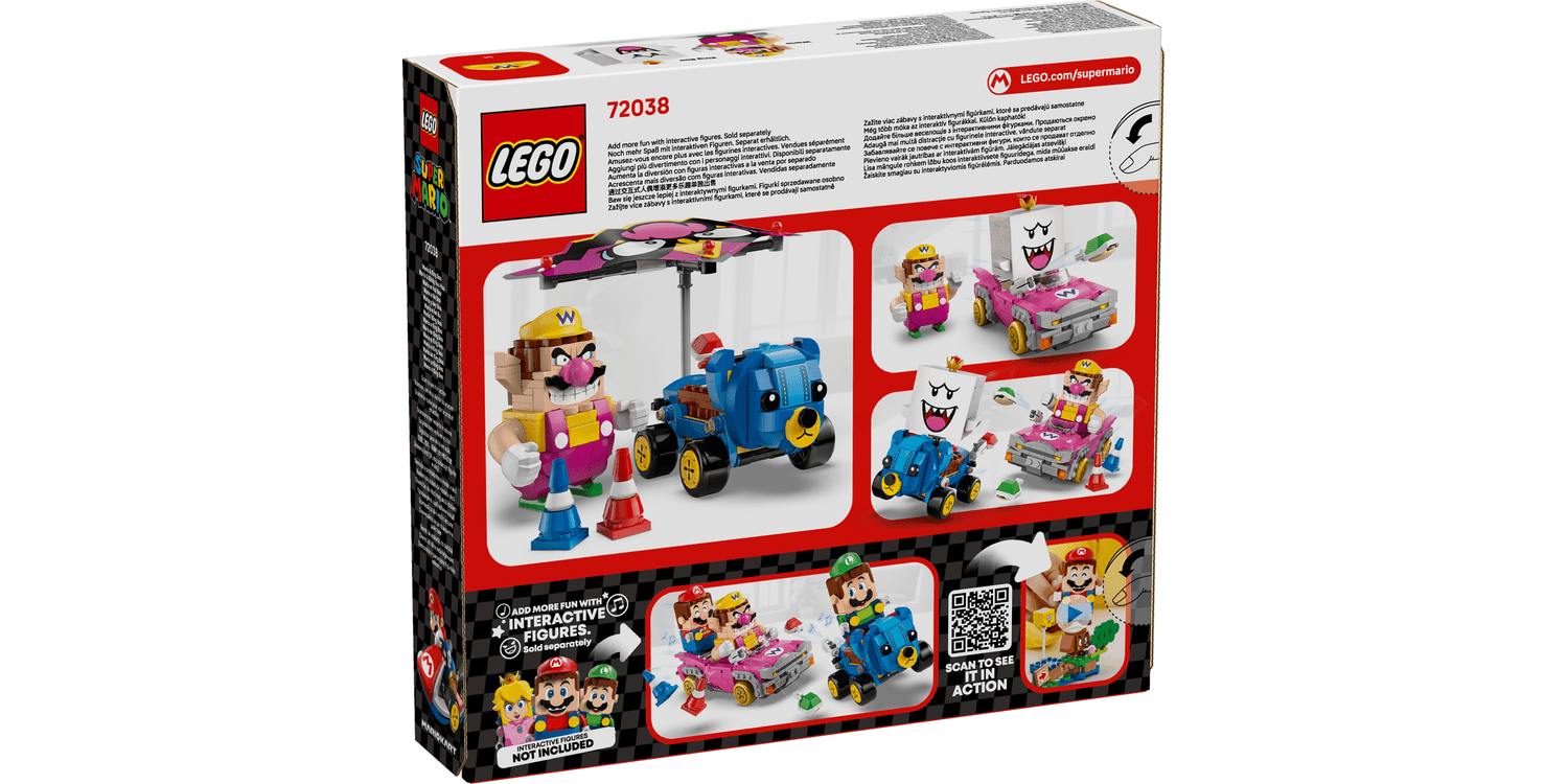 Race, drift, glide and battle with this LEGO Super Mario: Mario Kart – Wario & King Boo (72038) interactive toy for 8+ year old boys and girls. The Mario Kart toy features 2 LEGO Super Mario figures, brick-built models of the iconic Badwagon and Teddy Buggy vehicles, plus 2 traffic cones. Each car toy has a shell-launching function and drifting action, and the Badwagon has a detachable glider that also fits on the Teddy Buggy. Place a LEGO Mario, LEGO Luigi or LEGO Peach figure (from sets 71439, 71440, 71441 or 72043 – sold separately) in either kart for interactive play, triggering Mario Kart sound/visual effects for honking, drifting and gliding. This LEGO Super Mario building toy makes a fun gaming-themed birthday gift for 8+ year old boys, girls and fans. Find building instructions for this LEGO set in the box or on the LEGO Super Mario app and look out for other LEGO Super Mario: Mario Kart sets (sold separately) for other characters and vehicles to race and battle against.