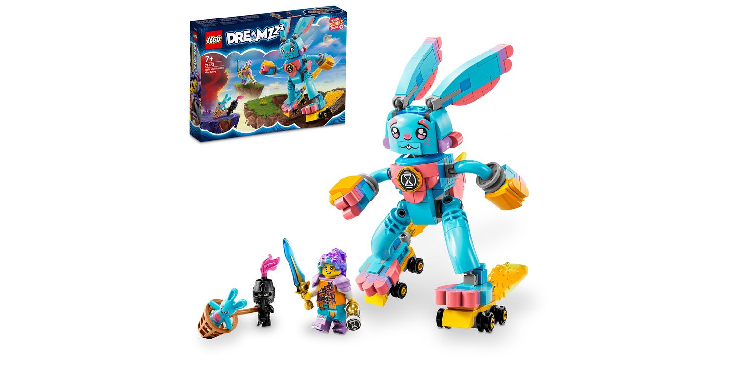 The large living version of Bunchu has a fully articulated neck, arms and legs. When building it, kids can use their imaginations and follow story-led building instructions to choose between equipping it with roller skates and gloves or bee wings and a stinger.  A detailed minifigure of Izzie helps bring the action to life. Izzie comes with accessories including armour, a sword and an hourglass. Figures of the Grimspawn and a small Bunchu are also included so kids can recreate the entire story.
