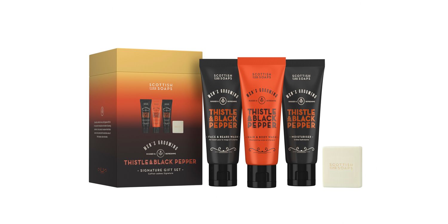 Feel the cool Highland breeze and the fresh scent of pepper, amber and musk as you indulge in our Signature Gift Set. Infused with soothing milk thistle, this set includes Face & Beard Wash, Hair & Body Wash, Moisturiser and Body Bar – leaving you feeling refreshed and refined.