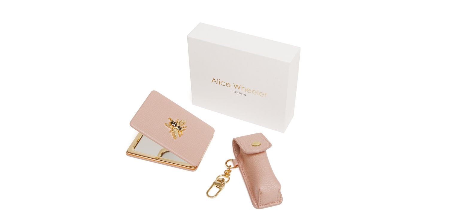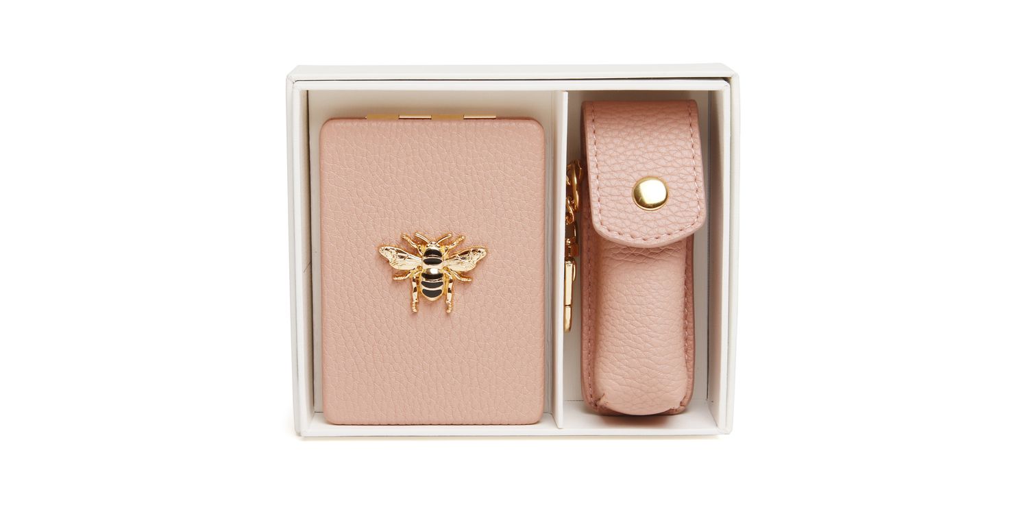 This set includes our popular vegan leather-covered Oblong mirror compact, a cornerstone of our design collection, known for its elegant appeal and practicality for both gifting and personal use. It also introduces our brand-new lipstick holder, a cute way to secure your favourite lipstick. It comes complete with a clip for attaching to one of our bags or even a keyring, keeping your essentials close at hand. Each set arrives in a pristine white gift box, expertly wrapped and ready for any occasion, making gifting effortless.