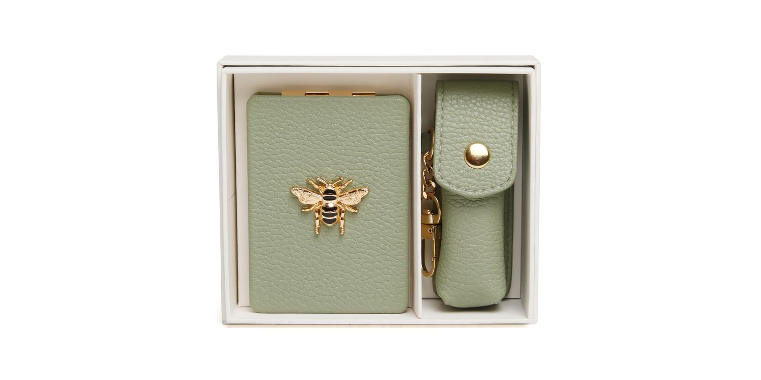 This set includes our popular vegan leather-covered Oblong mirror compact, a cornerstone of our design collection, known for its elegant appeal and practicality for both gifting and personal use. It also introduces our brand-new lipstick holder, a cute way to secure your favourite lipstick. It comes complete with a clip for attaching to one of our bags or even a keyring, keeping your essentials close at hand. Each set arrives in a pristine white gift box, expertly wrapped and ready for any occasion, making gifting effortless.