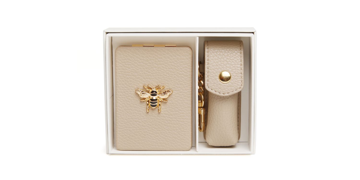 This set includes our popular vegan leather-covered Oblong mirror compact, a cornerstone of our design collection, known for its elegant appeal and practicality for both gifting and personal use. It also introduces our brand-new lipstick holder, a cute way to secure your favourite lipstick. It comes complete with a clip for attaching to one of our bags or even a keyring, keeping your essentials close at hand. Each set arrives in a pristine white gift box, expertly wrapped and ready for any occasion, making gifting effortless.
