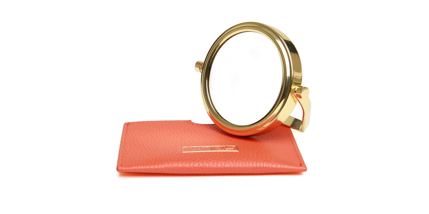 This double-sided gold mirror has a 1x and a 7x magnifying side, so you can check your makeup and hair with ease. It folds flat and fits neatly into its textured vegan leather pouch, which is enhanced with our fabulous signature logo. You can choose from a variety of colours to match your handbag and style.