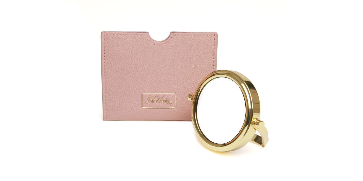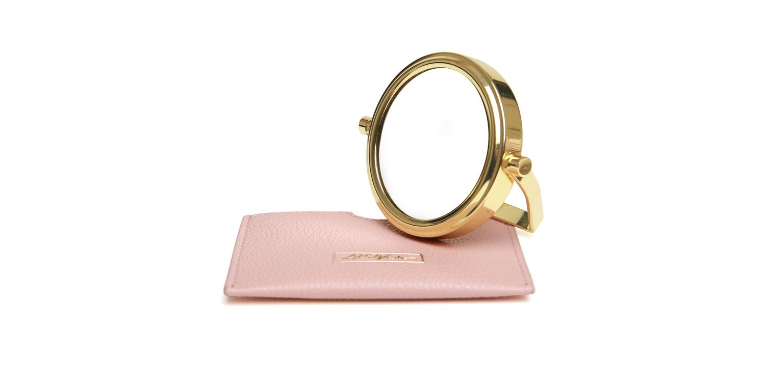 This double-sided gold mirror has a 1x and a 7x magnifying side, so you can check your makeup and hair with ease. It folds flat and fits neatly into its textured vegan leather pouch, which is enhanced with our fabulous signature logo. You can choose from a variety of colours to match your handbag and style.