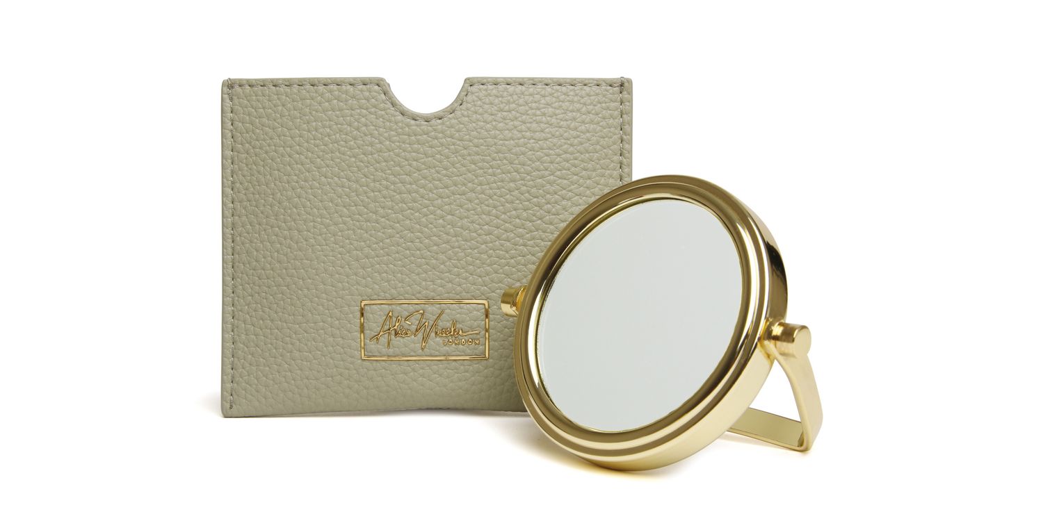 This double-sided gold mirror has a 1x and a 7x magnifying side, so you can check your makeup and hair with ease. It folds flat and fits neatly into its textured vegan leather pouch, which is enhanced with our fabulous signature logo. You can choose from a variety of colours to match your handbag and style.