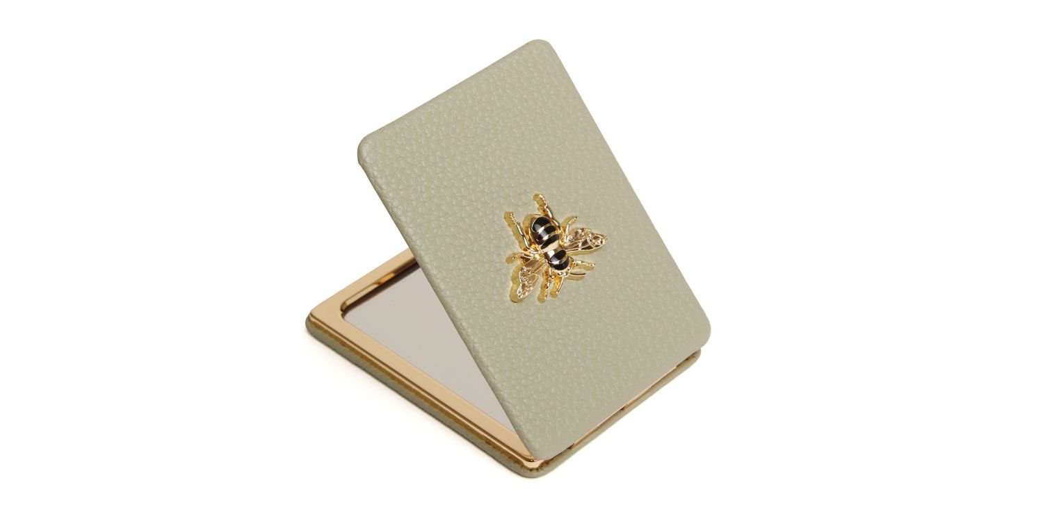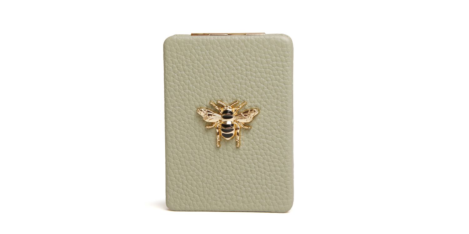 This refined accessory features a pair of gold-toned metal framed mirrors. Crafted with meticulous attention to detail, the mirror is encased in sumptuous vegan leather, adorned with Alice's iconic honey bee insignia, symbolizing the brand's commitment to sophistication and quality. Ideal for gifting, the mirror comes nestled in a bespoke textured box, complete with a moulded inner fitment, ensuring it remains pristine during travel and is easily postable. Beyond its packaging, the mirror integrates effortlessly into any Alice Wheeler accessory bag or beauty collection.
