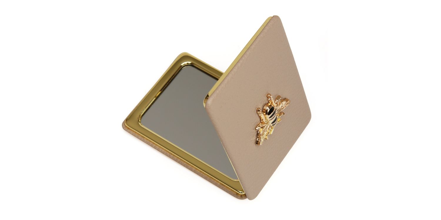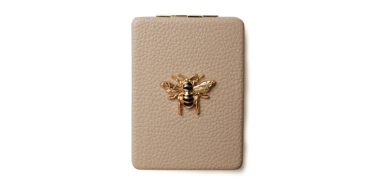 This refined accessory features a pair of gold-toned metal framed mirrors. Crafted with meticulous attention to detail, the mirror is encased in sumptuous vegan leather, adorned with Alice's iconic honey bee insignia, symbolizing the brand's commitment to sophistication and quality. Ideal for gifting, the mirror comes nestled in a bespoke textured box, complete with a moulded inner fitment, ensuring it remains pristine during travel and is easily postable. Beyond its packaging, the mirror integrates effortlessly into any Alice Wheeler accessory bag or beauty collection.