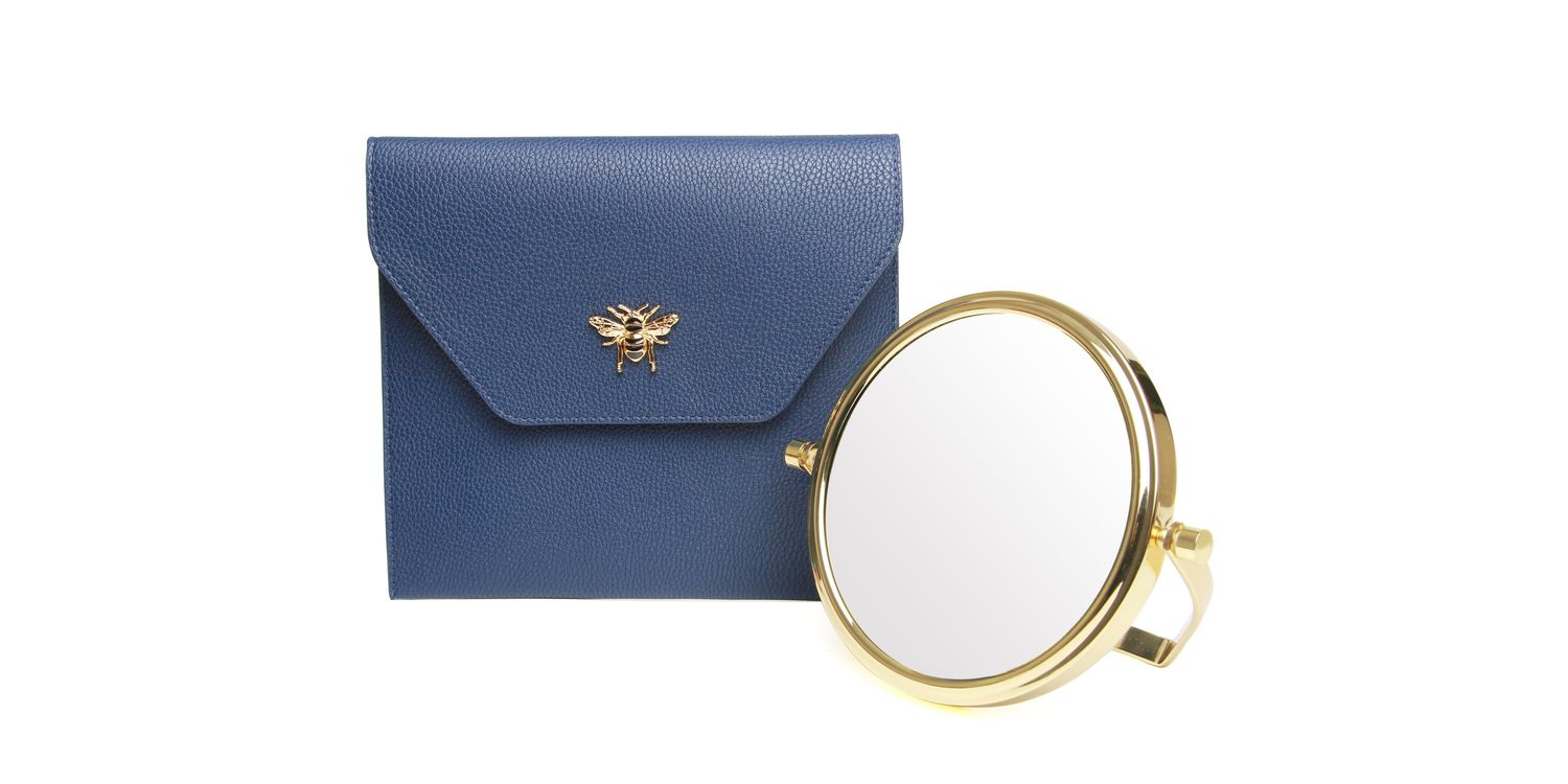 This gold mirror has two sides, one with 1x magnification and one with 7x magnification, so you can easily apply your makeup and style your hair. It folds flat and slips into luxury its pouch, which is adorned with our famous Honeybee Logo. You can pick from a range of colours to suit your taste.