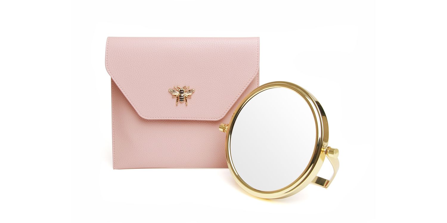 This gold mirror has two sides, one with 1x magnification and one with 7x magnification, so you can easily apply your makeup and style your hair. It folds flat and slips into luxury its pouch, which is adorned with our famous Honeybee Logo.