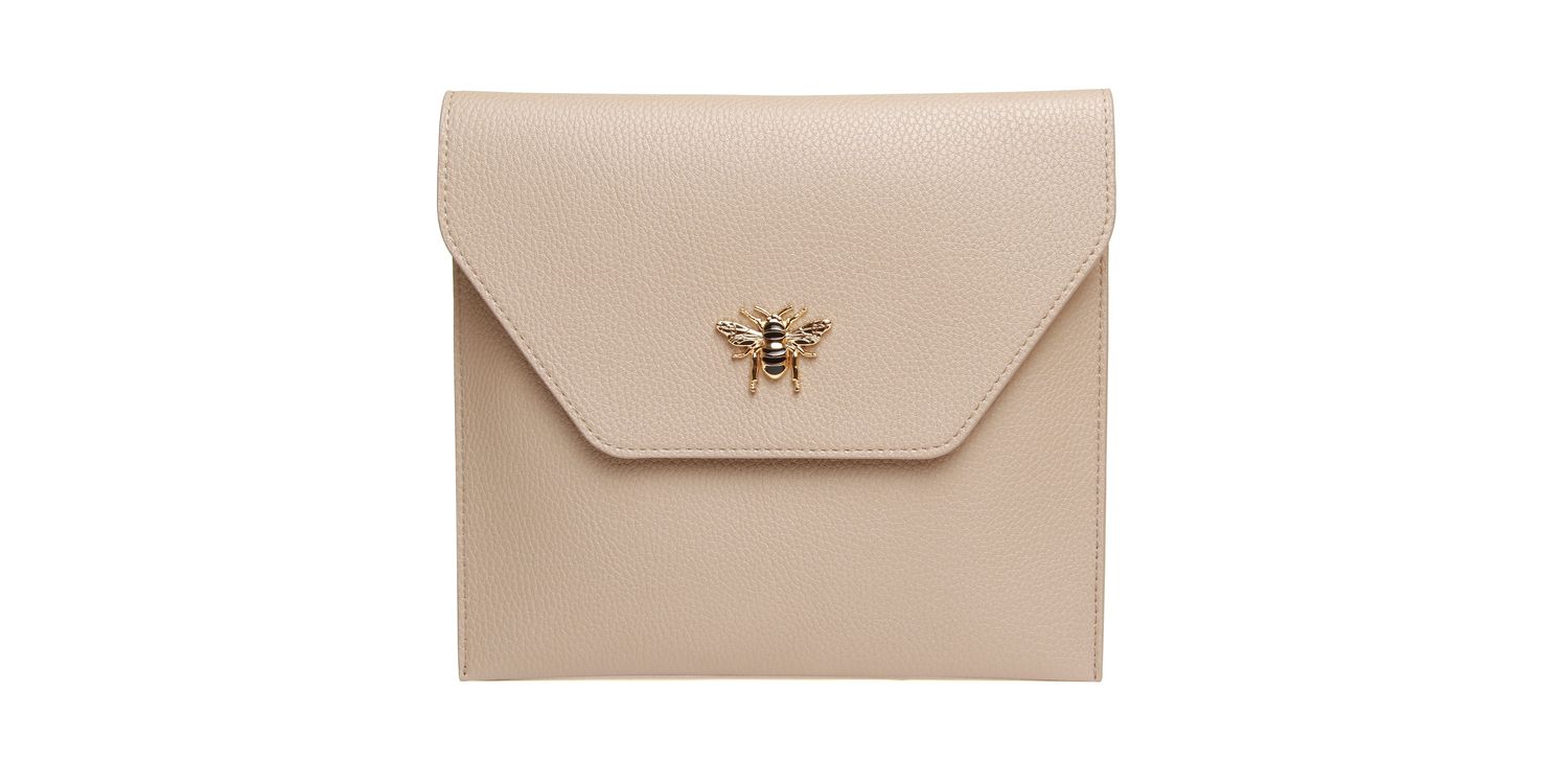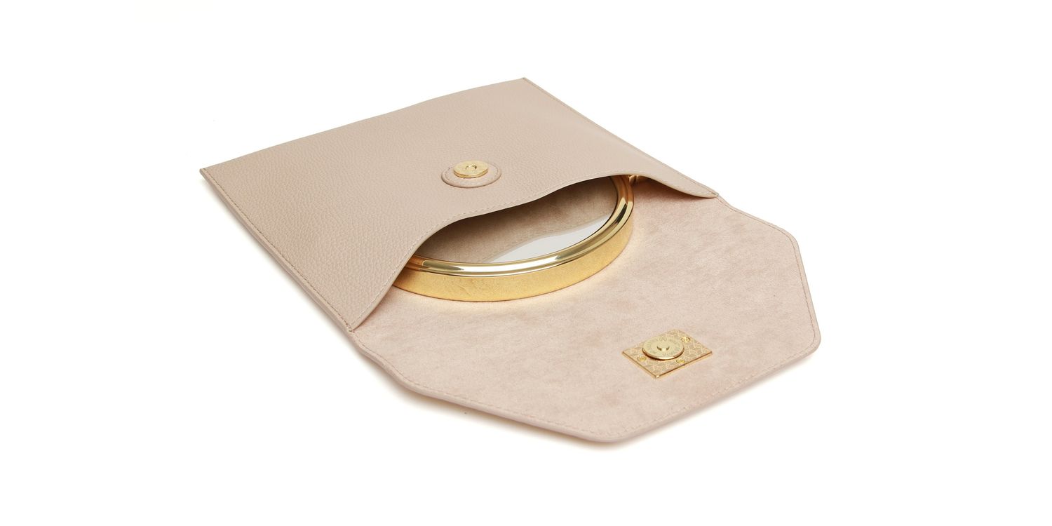This gold mirror has two sides, one with 1x magnification and one with 7x magnification, so you can easily apply your makeup and style your hair. It folds flat and slips into luxury its pouch, which is adorned with our famous Honeybee Logo.
