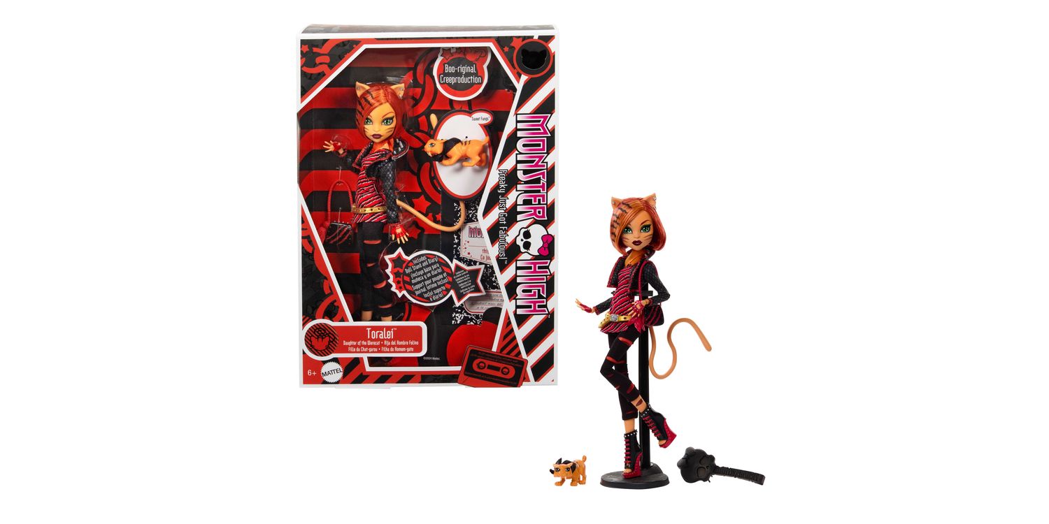 The original Monster High dolls return with creeproductions of everyone's favourite ghouls! First released in 2011, Toralei exudes cat-astrophically cool style in her trademark red and black lurk. She comes with her pet saber-tooth tiger cub Sweet Fangs, plus furrocious accessories and a top-secret diary. This collectible doll is a perfect gift for any fans of Monster High, as well as kids ages 6 years old and up! Doll stand included. Doll cannot stand alone. Colours and decorations may vary.