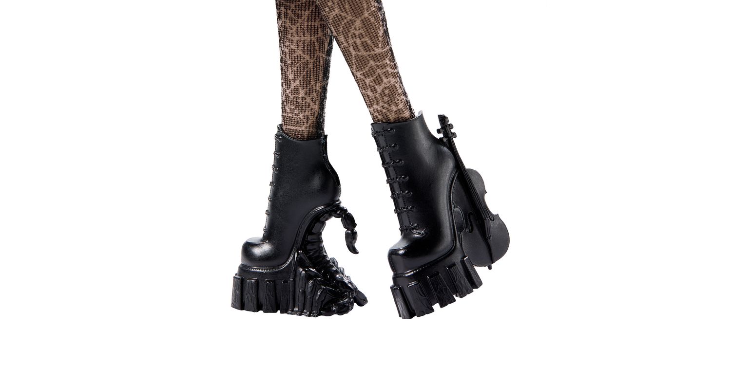 The minds behind Monster High and Wednesday have collaborated to create a chillingly beautiful line of dolls inspired by the hit television series. Dressed to distress in all black from head to toe, this Wednesday Addams collectible doll drips dark charm in her Nevermore Academy uniform. With Thing crouched at her shoulder and killer shoes at her feet, she's more than ready to uncover any morbid mysteries that lie in wait. Doll cannot stand alone. Doll stand included. Colours and decorations may vary.
