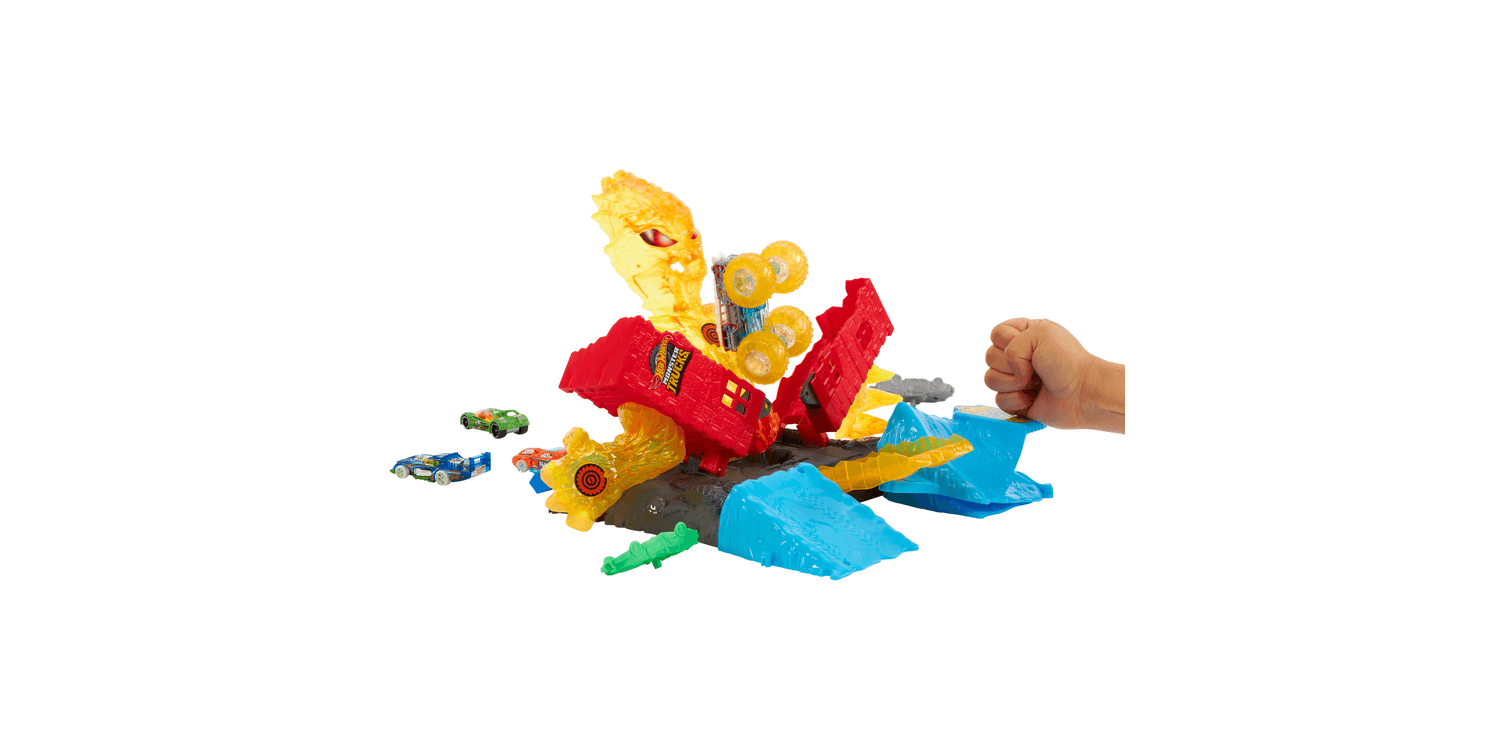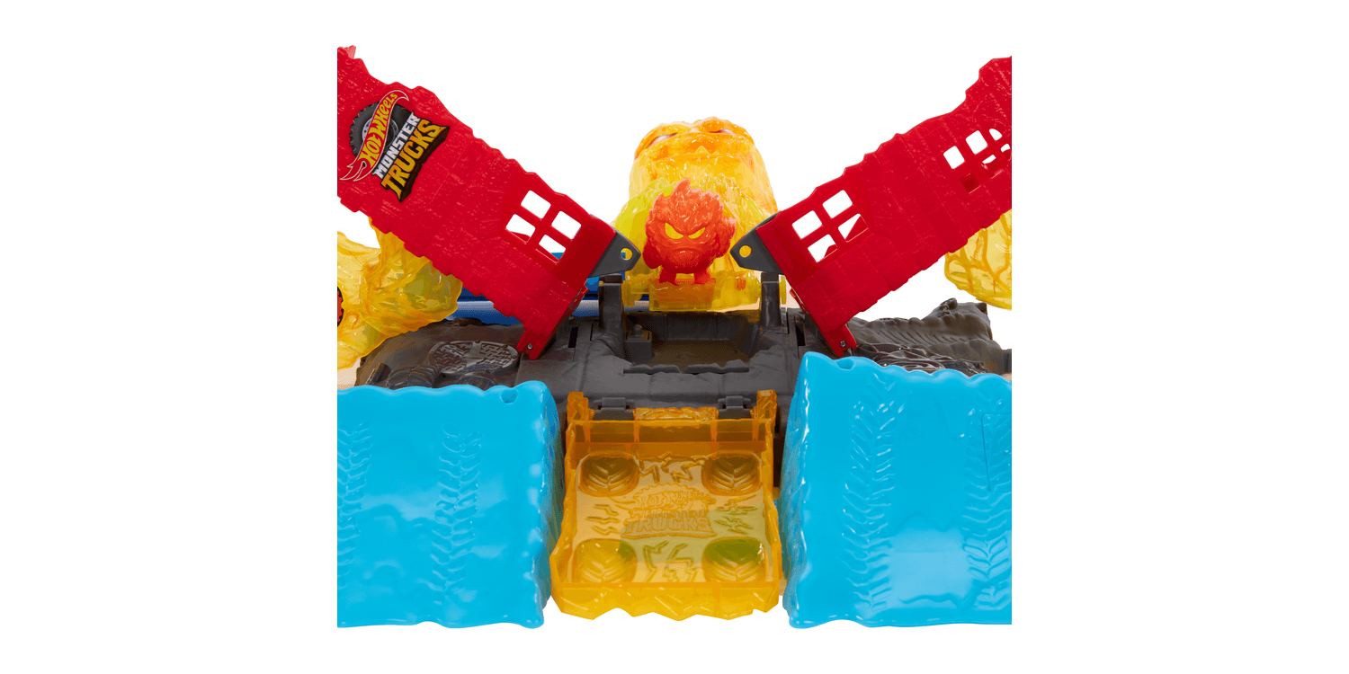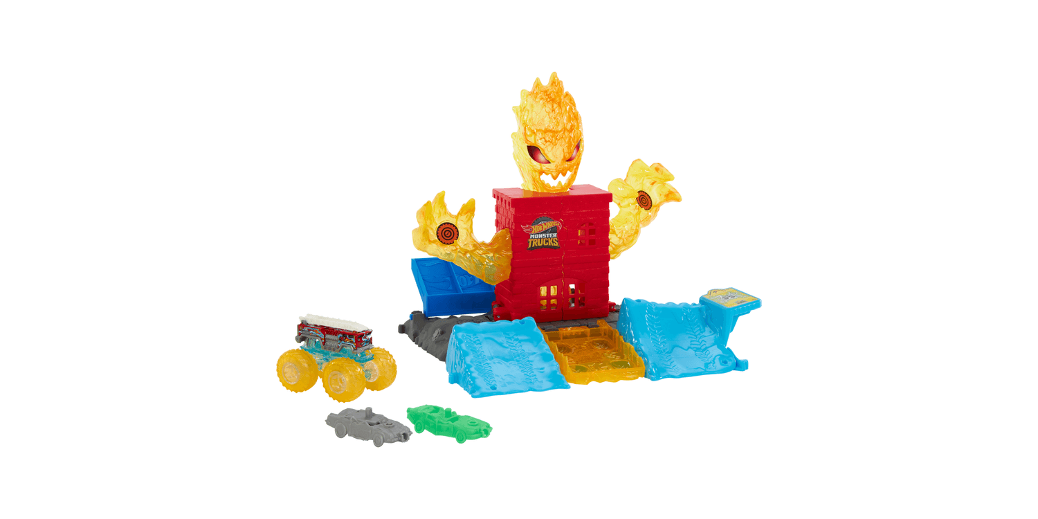 In the Hot Wheels Monster Trucks Power Smashers 5-Alarm Torch Tower Takedown, catapult or throw roll the included 1:64 scale 5-Alarm up a ramp and at smash spots to defeat the Fire Monster! Hit the smash spots to knock out the building and cause epic destruction. Once kids topple the Fire Monster, there's a funny reveal to cap off the crashing and smashing. One Hot Wheels Monster Trucks 5-Alarm and two crushed cars are included, and the set can connect to other playsets to build out a full arena of Monster Trucks mayhem. Additional sets sold separately. Colours and decorations may vary.
