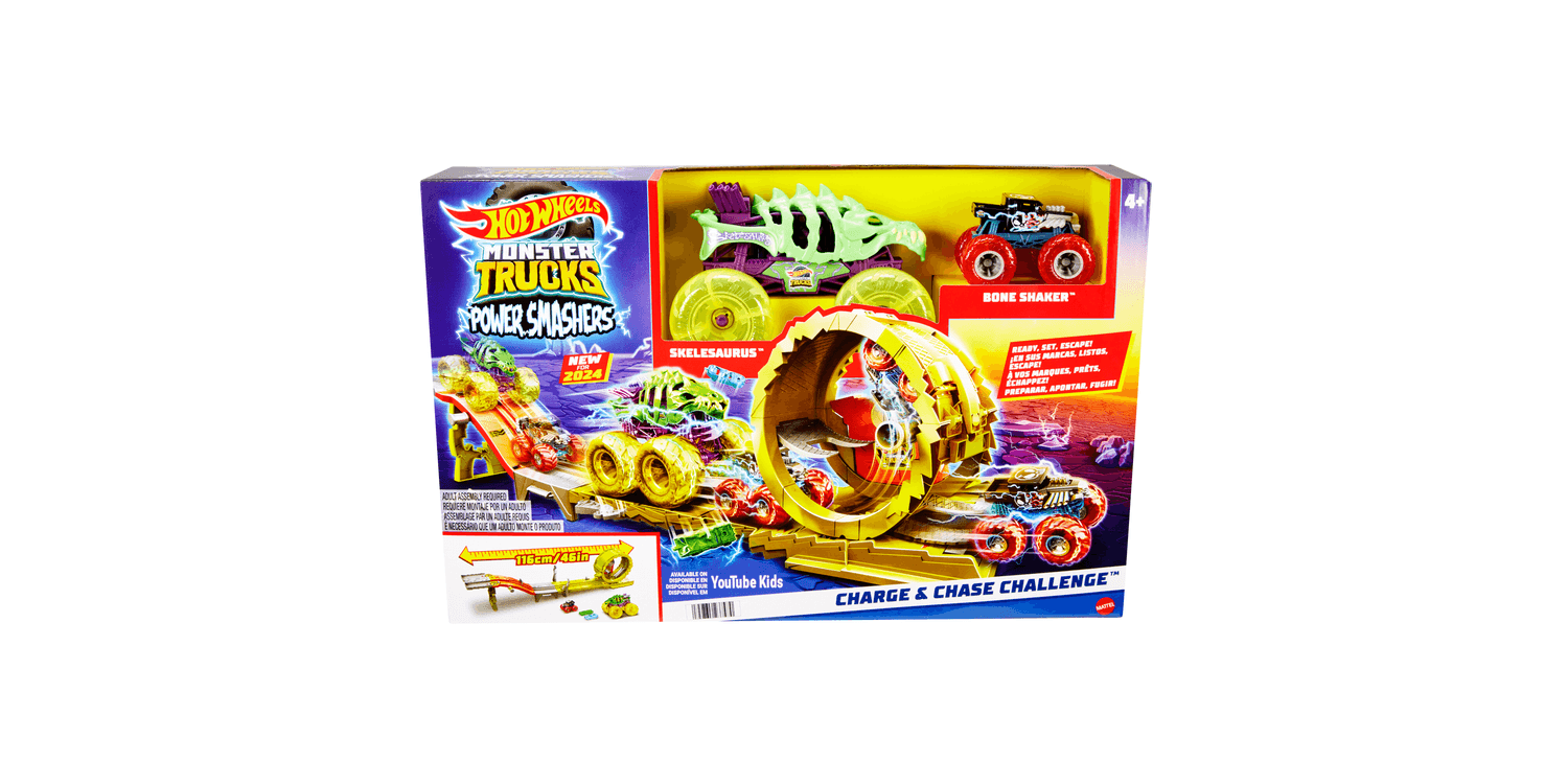 An oversized Skelesaurus and 1:64 scale Bone Shaker face off in a race to avoid destruction! Release the two vehicles with the power switch and see if Bone Shaker can beat out the evil foe as they speed down a hill toward a massive loop. A randomizer selects one of two outcomes: Bone Shaker makes it through the loop and escapes to safety while Skelesaurus gets left in the dust, or Skelesaurus catches its prey, trapping Bone Shaker in the loop, knocking it over. Set includes two crushed cars for extra destruction. Colours and decorations may vary.