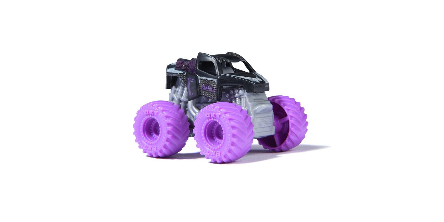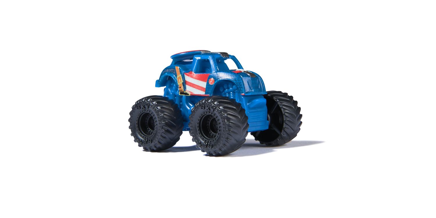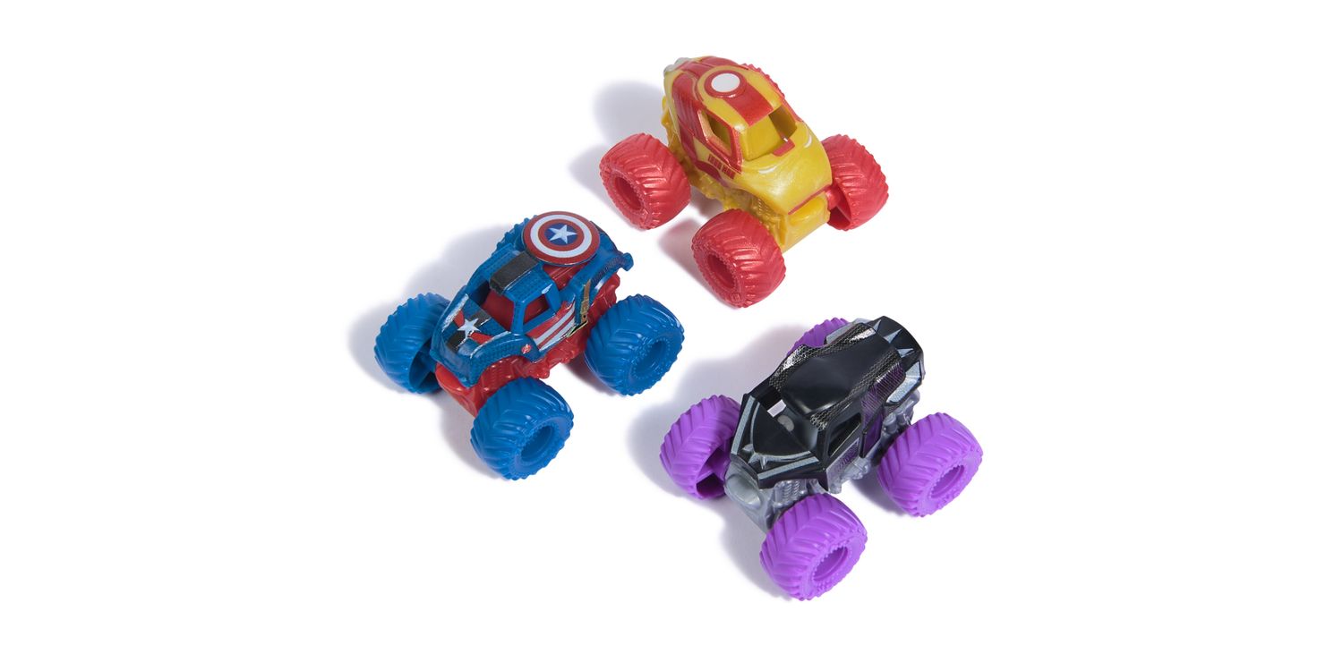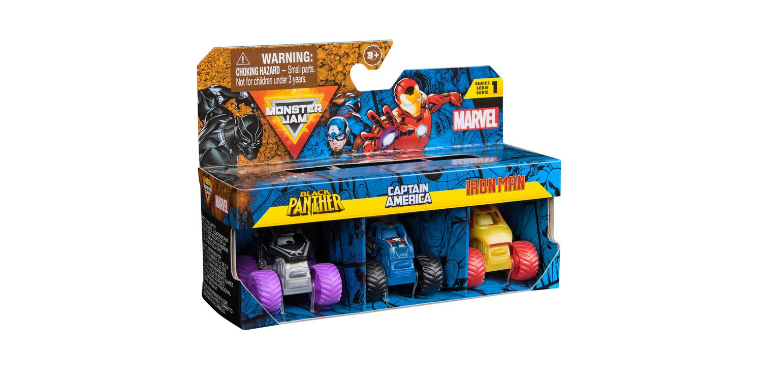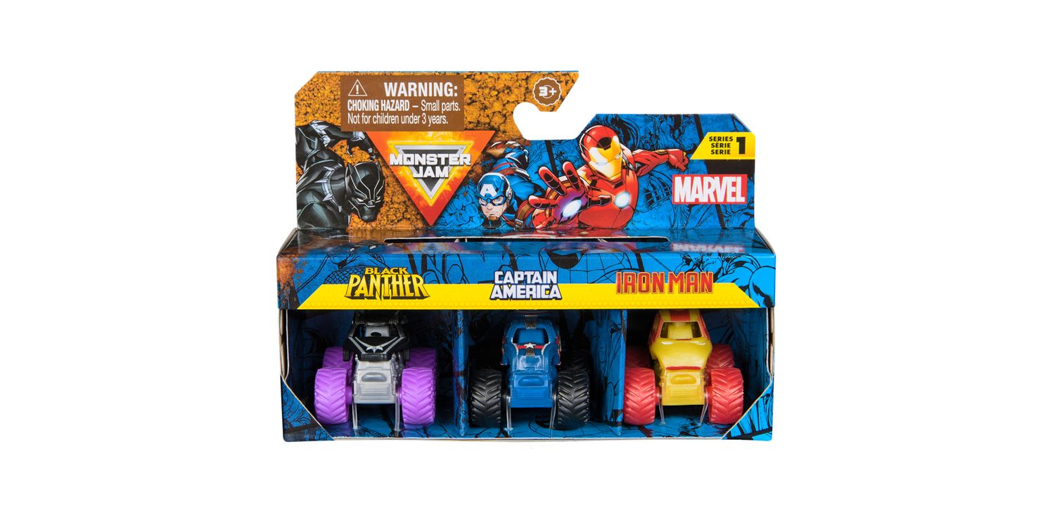 Charge into thrilling Monster Jam battles with the official mini Monster Jam Marvel 1:87 scale die-cast truck 3-Packs. Each set stars 3 Marvel iconic heroes, such as Black Panther, Captain America, Iron Man, Thor and War Machine. These monster trucks, emblazoned with the symbols and colours of your favourite Super Heroes, bring home the spectacle of superpowers and stadium stunts. Boasting authentic BKT tyres and hero-themed rims, these trucks capture the excitement of Monster Jam events and the essence of the superheroes they represent. The Super Hero collection allows children to recreate stunts and breath-taking jumps, bringing the Monster Jam action home. These toys are designed for both play and display, igniting imaginations and enabling storytelling with each spin of the wheels. Ideal for young fans, the Marvel Monster Jam trucks are a catalyst for creativity, heroism and adventure, allowing kids to craft their own narratives of courage and resilience. Rev up those engines and prepare for a playtime that’s nothing short of epic—where heroes meet horsepower and the Monster Jam action never ends. Includes: 3 Monster Jam 1:87 Scale Monster Trucks
