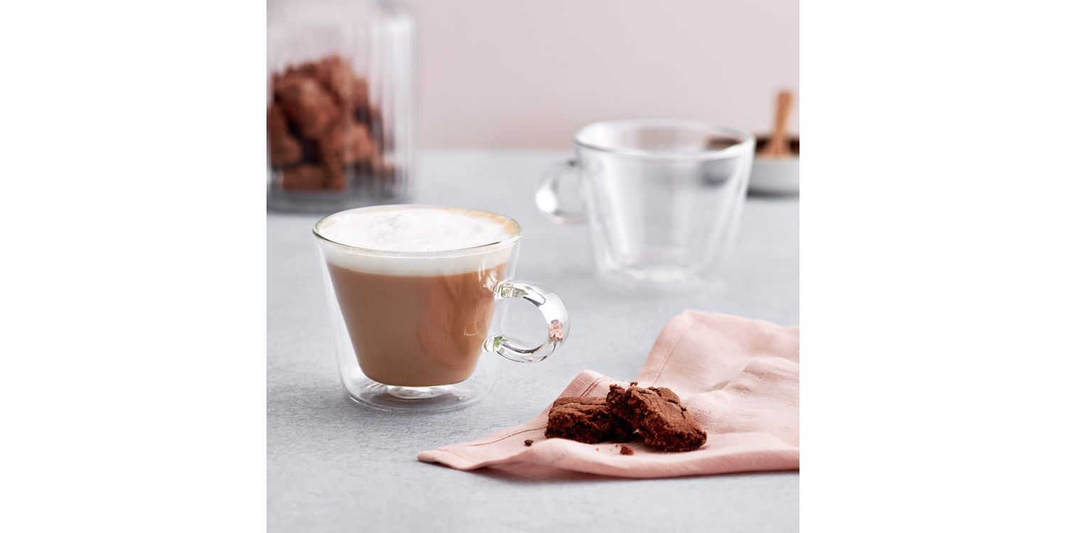 Set of 2 thermally insulated Cappuccino glasses (250ml), hand crafted and individually mouth-blown in a contemporary design. Their double walled construction means drinks stay hot for longer while the exterior remains cool to the touch. Made from Borosilicate glass for superior strength and clarity, these glasses are both scratch resistant and dishwasher safe.
