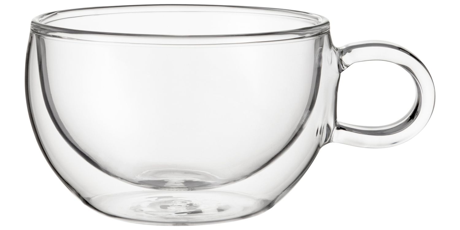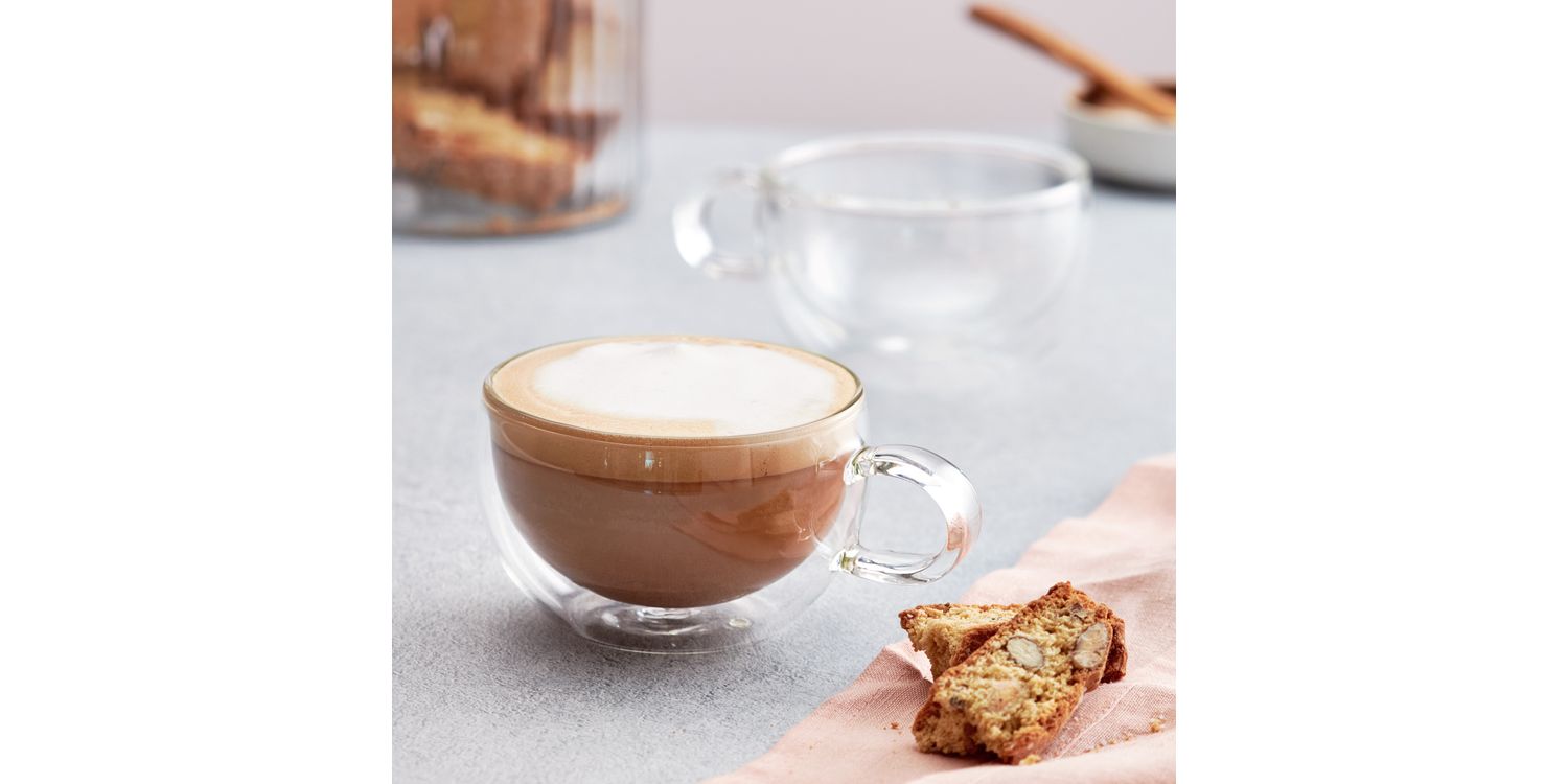Set of 2 thermally insulated Cappuccino glasses (250ml),  hand crafted and individually mouth-blown in a stylish design. Their double walled construction means drinks stay hot for longer while the exterior remains cool to the touch.