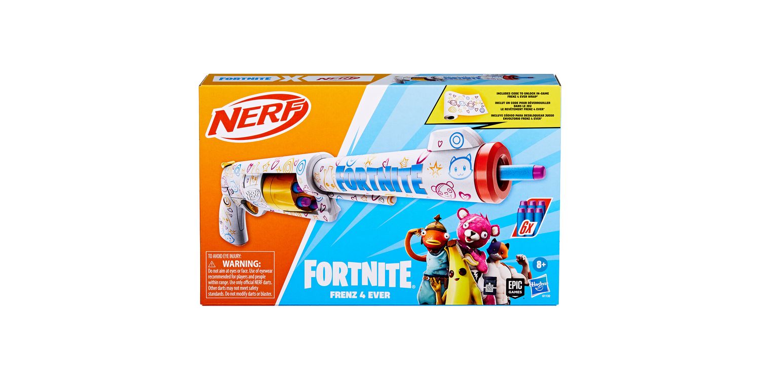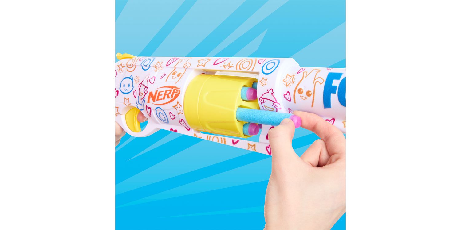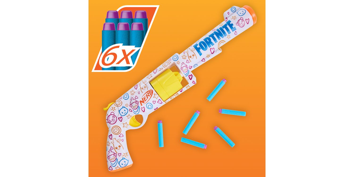 The Nerf blaster has a rotating drum with 6-dart capacity and includes 6 Nerf Elite foam darts. With its colourful wrap, hammer priming action, and cool rotating drum, the Hasbro Fortnite blaster is sure to catch the attention of opponents when you drop into Nerf battles. Nerf foam darts are perfect for indoor and outdoor battles and tested and approved for performance and quality. The Frenz 4 Ever blaster is a perfect gift for Fortnite fans and a great addition to Nerf collections for play and display. Eyewear recommended (not included). No batteries needed.