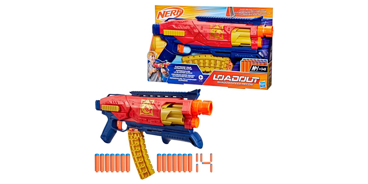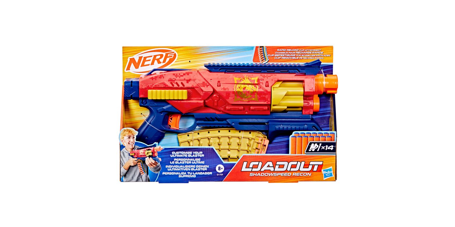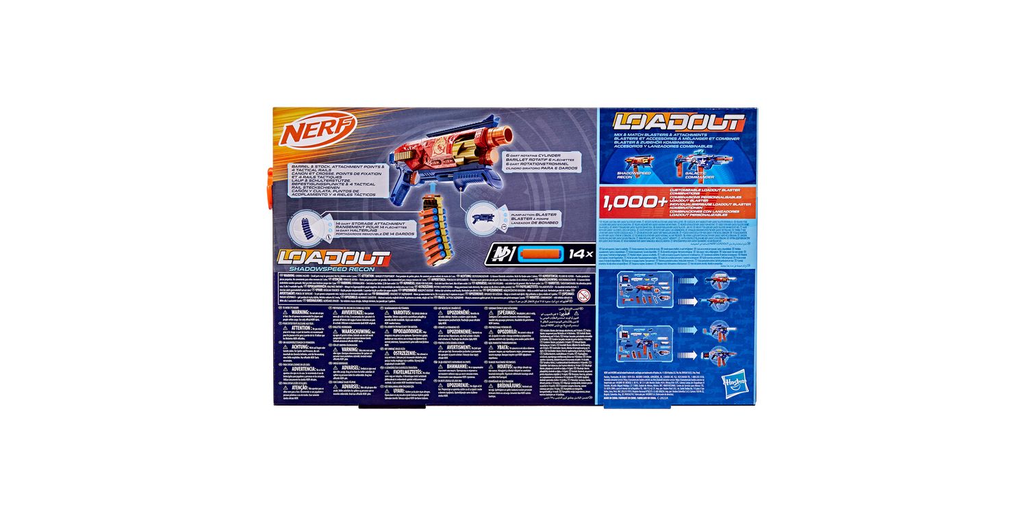 Bring video games to life and customize your ultimate blaster! Nerf Loadout dart blasters include interchangeable attachments to mix and match for more than 1000 combinations! The Nerf Loadout Shadowspeed Recon blaster includes a 14-dart storage attachment for rapid reloading that’s interchangeable with all other Loadout blasters. Fire into stealth missions with this pump action blaster that has a 6-dart revolving cylinder and features the epic Shadowspeed Recon skin. The Nerf Loadout Shadowspeed Recon blaster includes 14 Nerf N1 darts designed for extreme accuracy, speed, and distance. Build your Nerf Loadout blaster stockpile for endless customizable options (each sold separately, subject to availability). Nerf N1 darts are compatible only with Nerf N1 dart blasters. Eyewear recommended (not included).